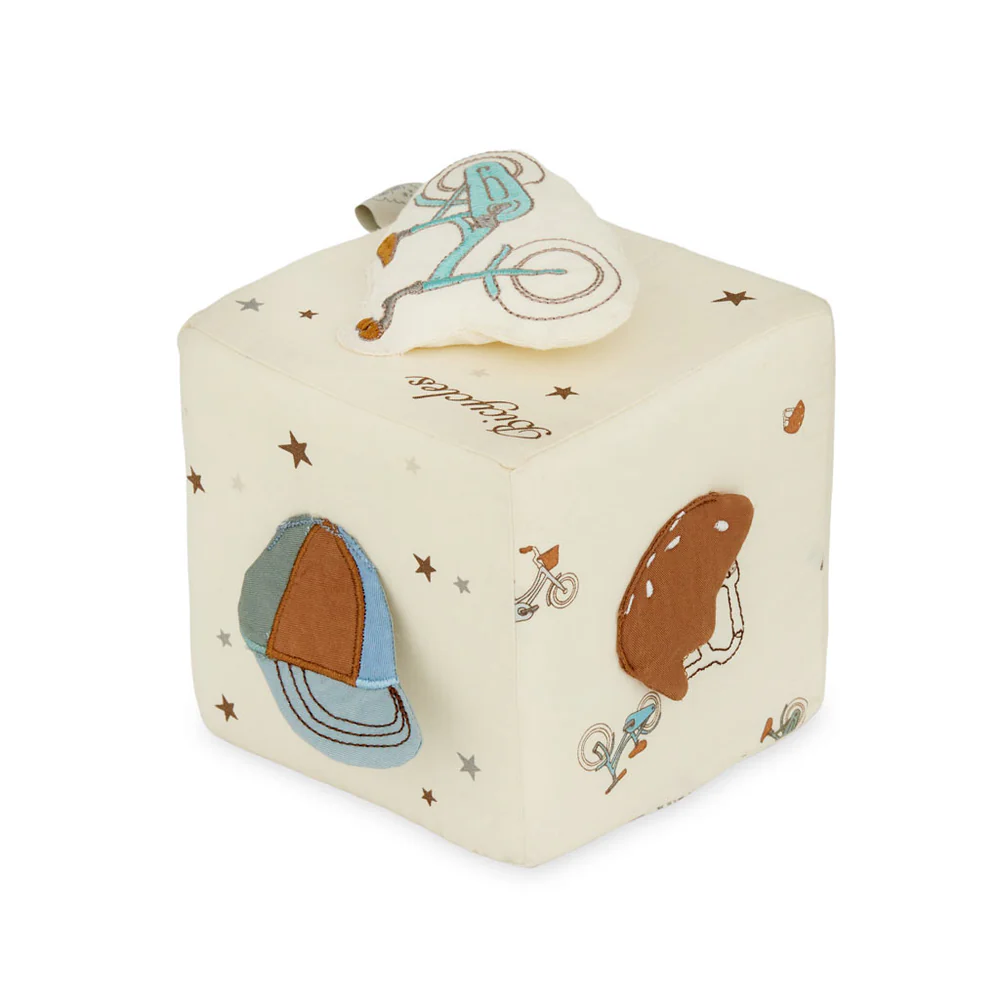 Weicher und verspielter Cam Cam Activity-Würfel aus Bio-Baumwolle mit süßen Applikationen.