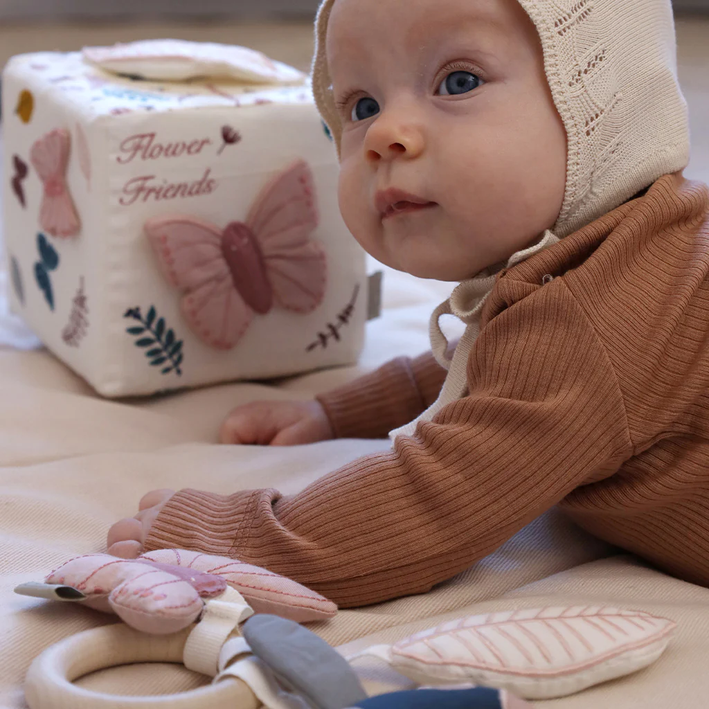 Weicher und verspielter Cam Cam Activity-Würfel aus Bio-Baumwolle mit Drucken und Applikationen der Cam Cam Copenhagen Dreamland-Kollektion.
