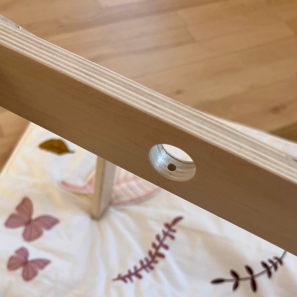 Der Spielbogen hat drei große Löcher zum Aufhängen von Spielsachen mit Haken oder Schlaufen und kleinere Löcher zum Aufhängen von Spielsachen mit einem Schnuraufhängesystem.