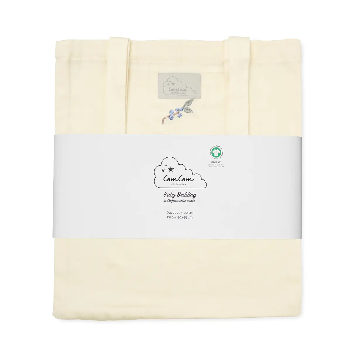 Weiche Cam Cam bestickte Baby Bettwäsche in Satin-gewebter GOTS-zertifizierter Bio Baumwolle. Die Bettwäsche ist in vielen verschiedenen Größen und Cam Cam Mustern erhältlich und wird in einer passenden Stofftasche geliefert.