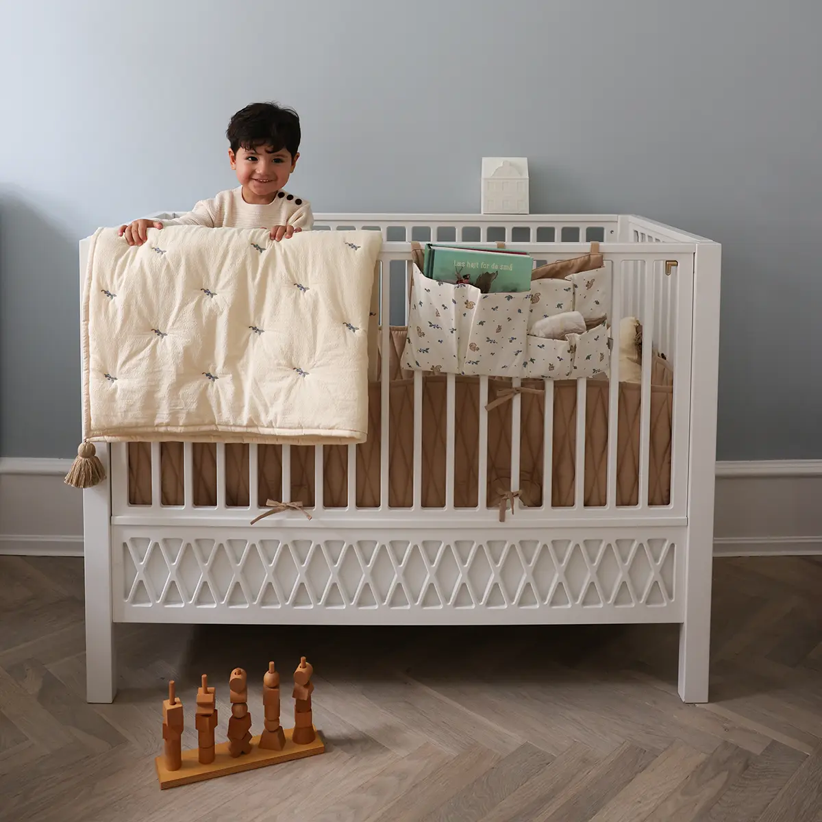 Die Cam Cam Betttasche ist die perfekte Lösung, um wichtige Dinge für die Schlafenszeit immer griffbereit zu haben. Egal ob Schnuller, Bücher, Kuscheltücher oder andere kleine Schätze – in dieser stilvollen und praktischen Tasche ist alles ordentlich verstaut und jederzeit zugänglich. Sie lässt sich ganz einfach am Kinderbett befestigen und fügt sich mit ihrem schlichten, zeitlosen Design harmonisch in jedes Kinderzimmer ein.