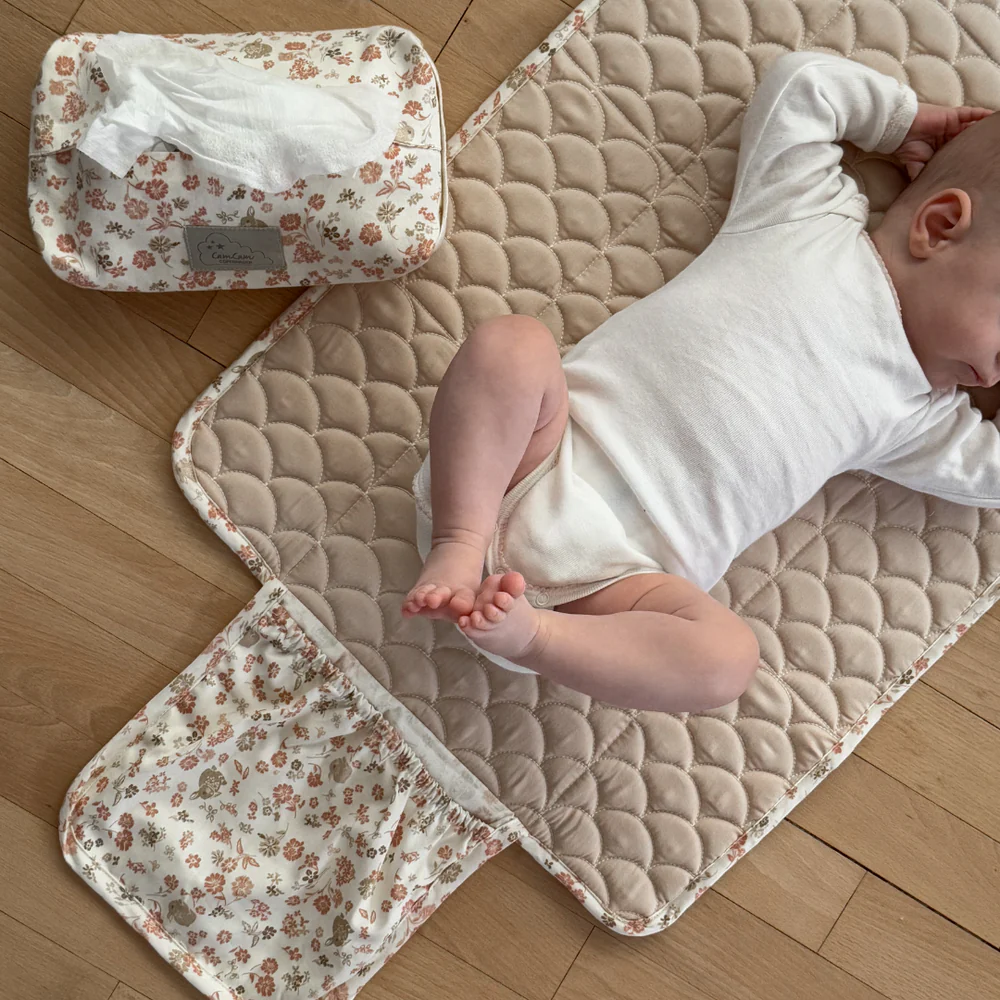 Hübsche und praktische Cam Cam Copenhagen Wickelunterlage mit schönem, gestepptem Wellenmuster. Die Unterlage ist perfekt für alle Wickelsituationen unterwegs. Sie ist ganz einfach mit einer Hand zu kleiner Grösse faltbar und passt damit in jede Wickeltasche. Sie hat eine praktische kleine Tasche, hier passen zum Beispiel eine Windel und ein Musselintuch rein. Die Unterlage ist oberflächenbeschichtet und somit schmutz- und wasserabweisend. Die Wickelunterlage ist wattiert um deinem Baby eine weiche und komfortable Liegefläche zu bieten.