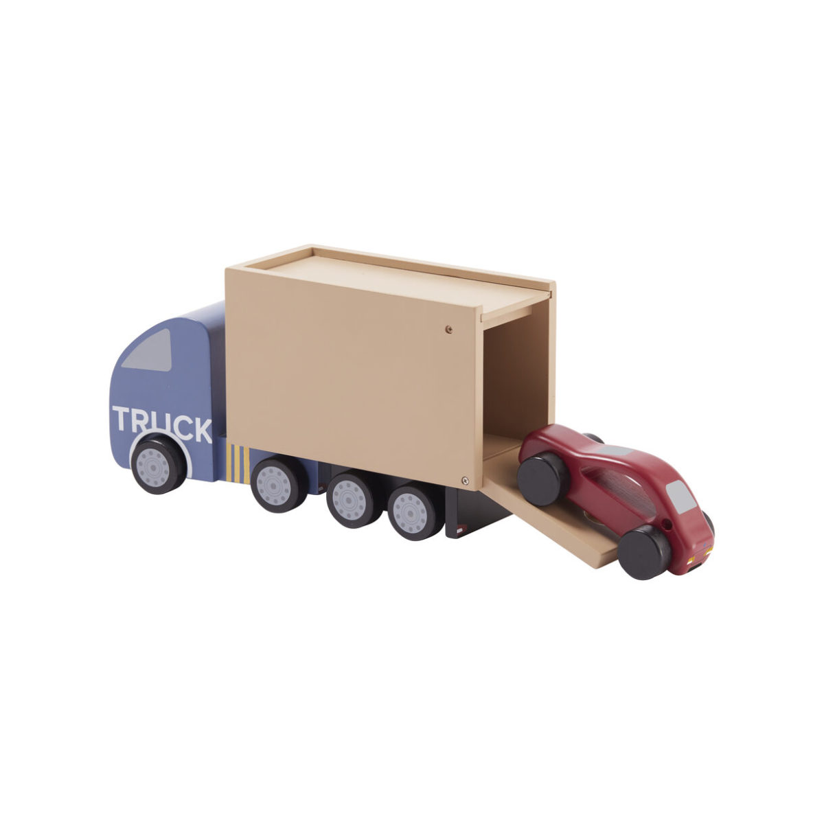 Leicht gleitender Kids Concept Laster Aiden mit Platz für Autos und andere Dinge, die für die Fahrt benötigt werden. Der Anhänger des Trucks hat zwei Öffnungen: einen oberen Deckel und eine hintere Ladetür. Durch das Entfernen des oberen Deckels könnten sogar kleine Teddys Platz nehmen. Die Hintertür schließt ganz leicht mit einem Magnetverschluss. Der Anhänger kann von der LKW-Front getrennt werden. Der Truck ist Teil der Kids Concept Aiden-Kollektion.