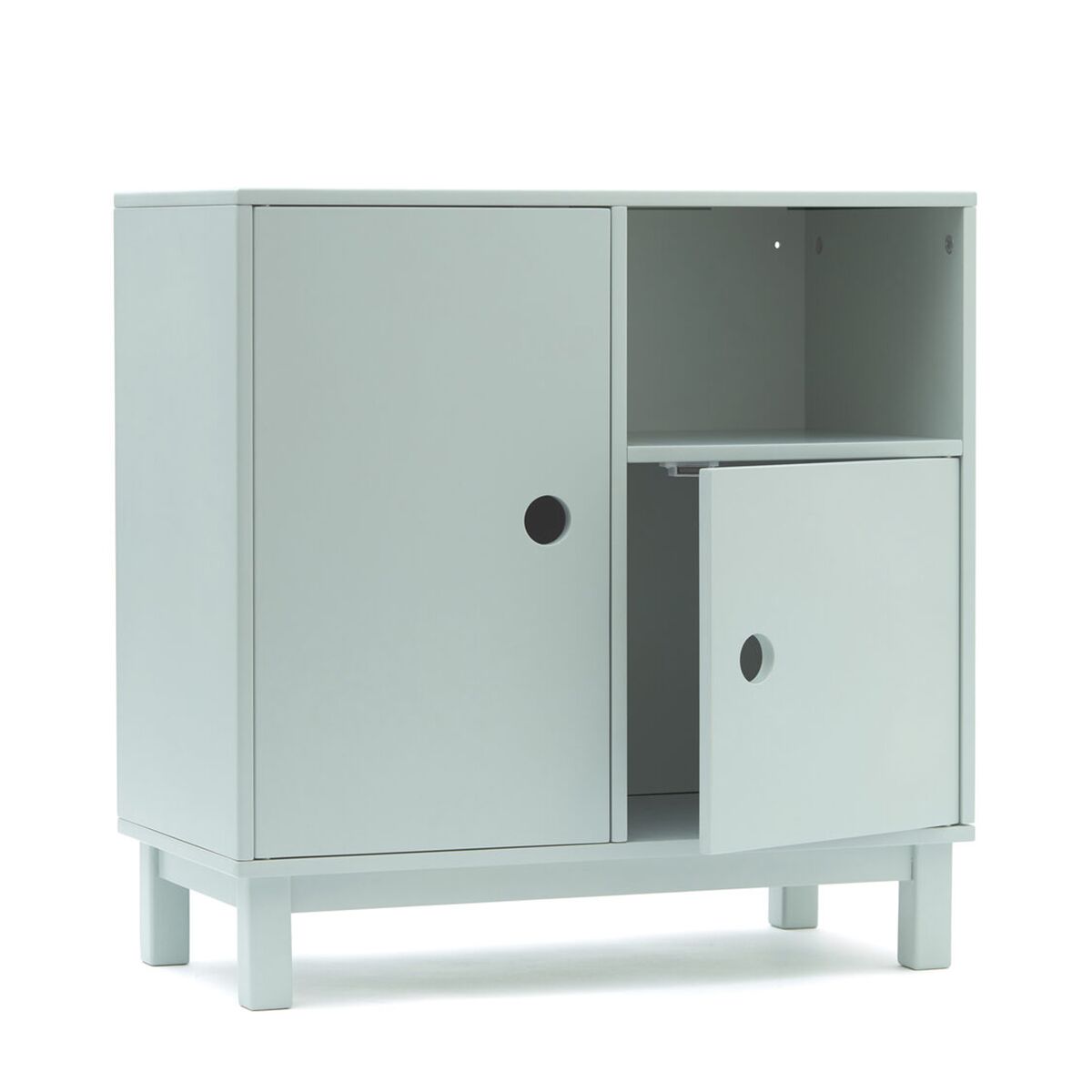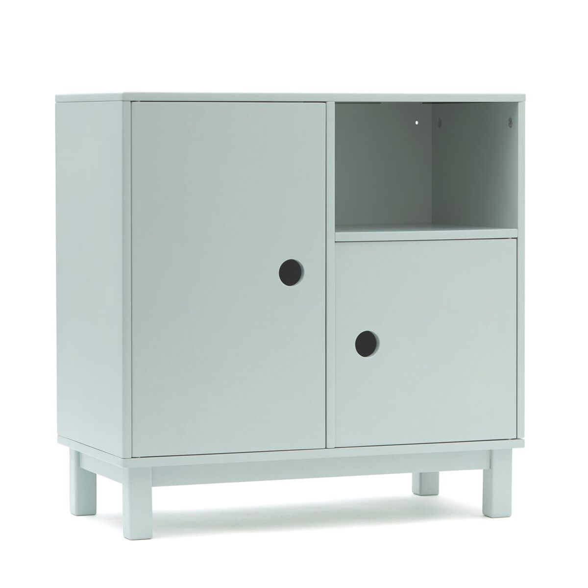 Der Kids Concept Kinderschrank besteht aus Holz und besteht aus drei Teilen – zwei mit einer Tür und einer, die offen ist. Hinter der großen Tür auf der linken Seite befinden sich zwei frei höhenverstellbare Ablagen für Spielzeug und Spiele.