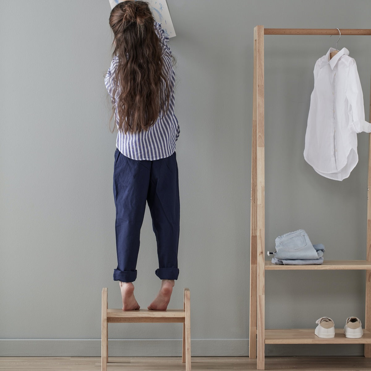 Die Kids Concept Kleidergarderobe Saga repräsentiert die klare und minimalistische Ästhetik des skandinavischen Designs, das sich ideal in jeden Wohnraum einfügt. Das schlichte, natürliche Finish harmoniert wunderbar mit den kindgerechten Proportionen, sodass Ihr Kind seine Kleidung und Accessoires mit Leichtigkeit selbst organisieren kann.