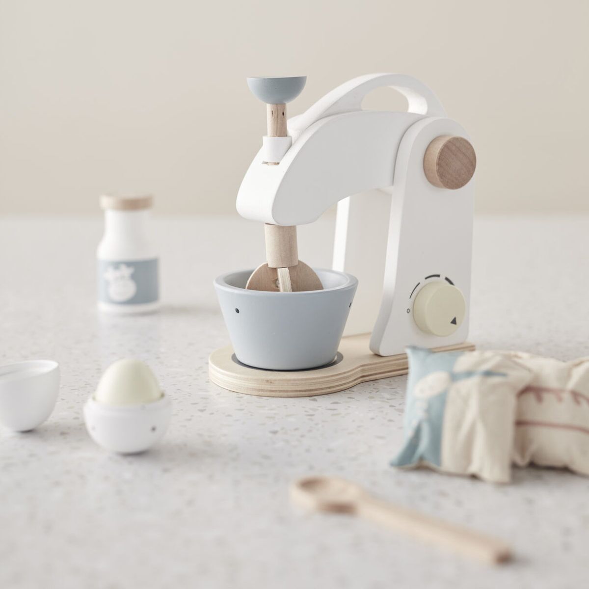 Hölzerne Kids Concept Mixer mit Zubehör in hellen Farben. Perfekt für den kleinen Bäcker, der seinen Lieblingskuchen nachbacken möchte. Der Holzmixer wird mit folgendem Spielzubehör geliefert: Schüssel, Schneebesen, Milchflasche, Mehlsack und Zuckersack.