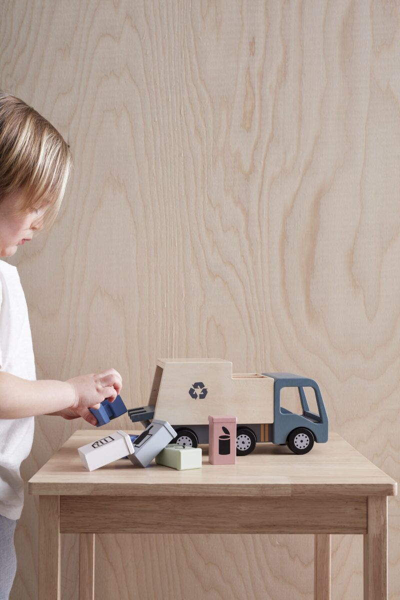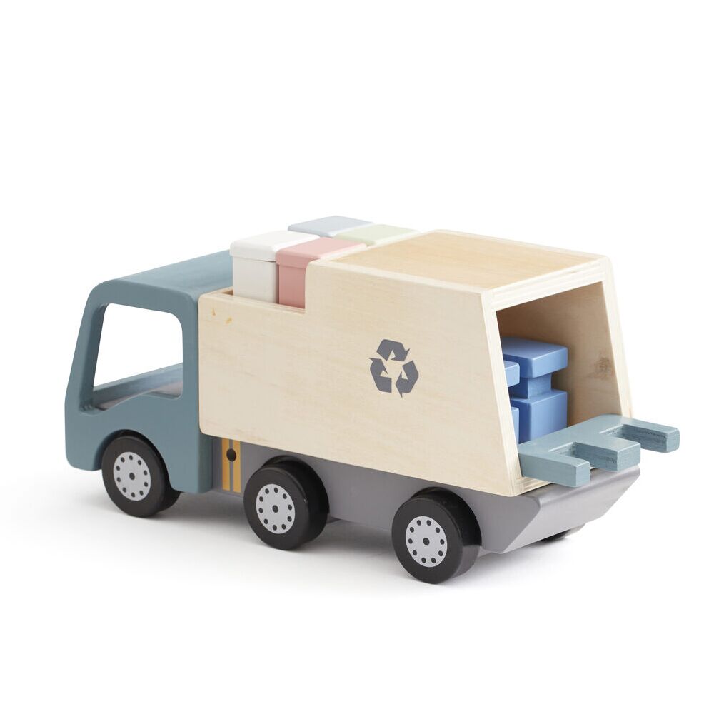 Recyclingzeit! Hölzerner Kids Concept Müllwagen Aiden mit vier Papierkörben, die in den Müllwagen gehoben werden können. Die Papierkörbe haben unterschiedliche grafische Symbole für Papier, Glas und Metall.