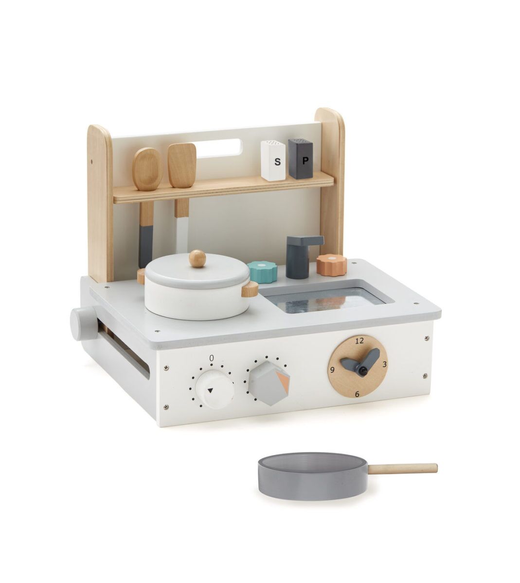 Die faltbare Kids Concept Tischküche wird mit viel Zubehör geliefert: Schöpflöffel, Spatel, Kochtopf und Bratpfanne sowie Salz- und Pfefferstreuer. Im zusammengeklappten Zustand hat die Miniküche einen Griff und kann einfach getragen werden.