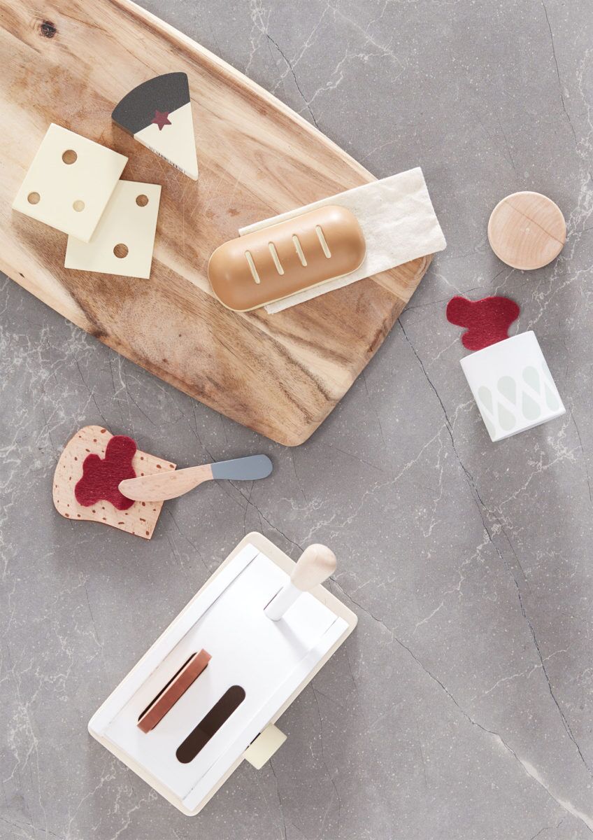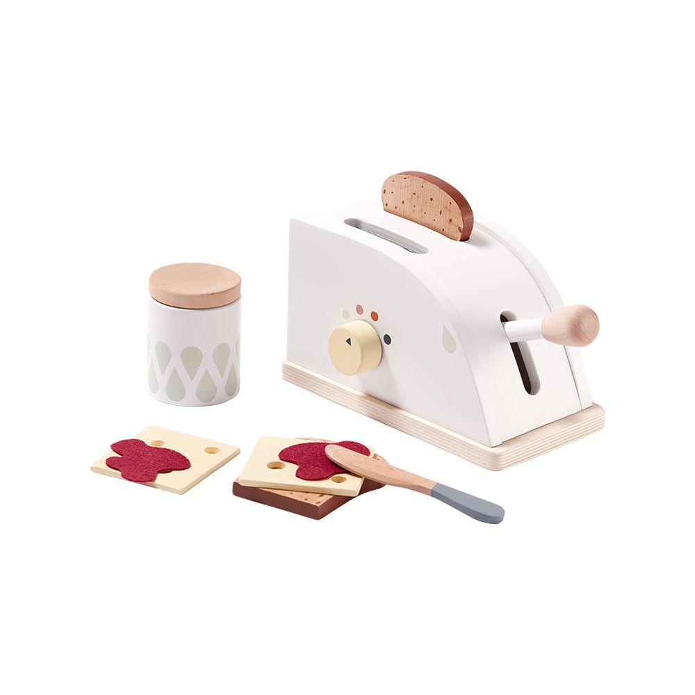 Kids Concept Toaster aus Holz mit 8 Zubehörteilen. Ein Glas Marmelade, 2 Scheiben Brot, 2 Käsescheiben, 2 Stücke Marmelade und ein Streichmesser sind im Lieferumfang enthalten. Verwenden Sie den Hebel, um die gerösteten Scheiben zu öffnen, und drehen Sie den Knopf, um die Hitze einzustellen. Jetzt kann Ihr kleiner Liebling sich selber und Ihnen spielerisch ein Toast rösten.