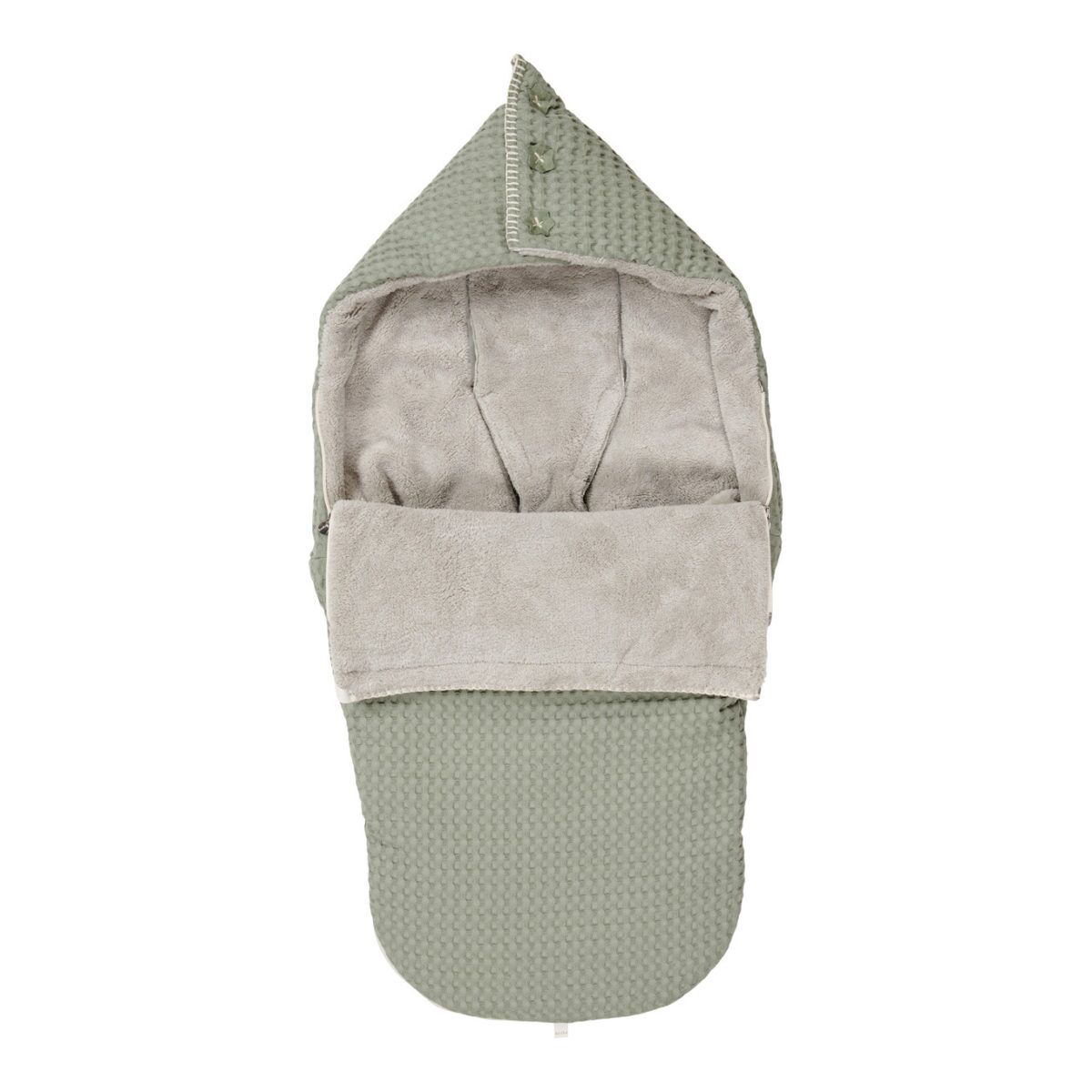 Der koeka Buggy Fußsack Oslo „shadow green / misty grey“ hat an der Rückseite eine Öffnung mit Klettverschluss, wodurch Gurte leicht durch den Fußsack passen. Es ist möglich die Klappe mit Druckknöpfen zu befestigen. Ein weiteres großartiges Merkmal ist, dass die Vorderseite des Fußsacks komplett geöffnet werden kann, dieser Teil ist somit auch als Decke für das Baby benutzbar. Das obere Ende des Fußsacks ist mit einem Klettverschluβ ausgekleidet, damit kann dieser Teil in eine Kapuze umgewandelt werden.
