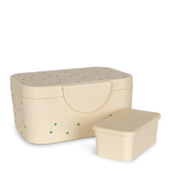 Die nachhaltige Konges Sløjd Brotdose ist ein hochwertiges, langlebiges und modernes Produkt für Ihr Kind. Die Snackbox ist aus Polyactid gefertigt und mit einfachen Verschlussklemmen ausgestattet, die ein Ausleeren des Inhalts verhindern. Ein praktisches Trennelement in der großen Brotbox ermöglicht es, Lebensmittel getrennt zu transportieren und zu lagern, während die kleinere Box mit Silikondeckel das Essen frisch hält. Diese Vesperdose kann leicht gereinigt werden und bietet Ihnen eine sichere und ökologische Lösung für den Schul- oder Kindergartenalltag.