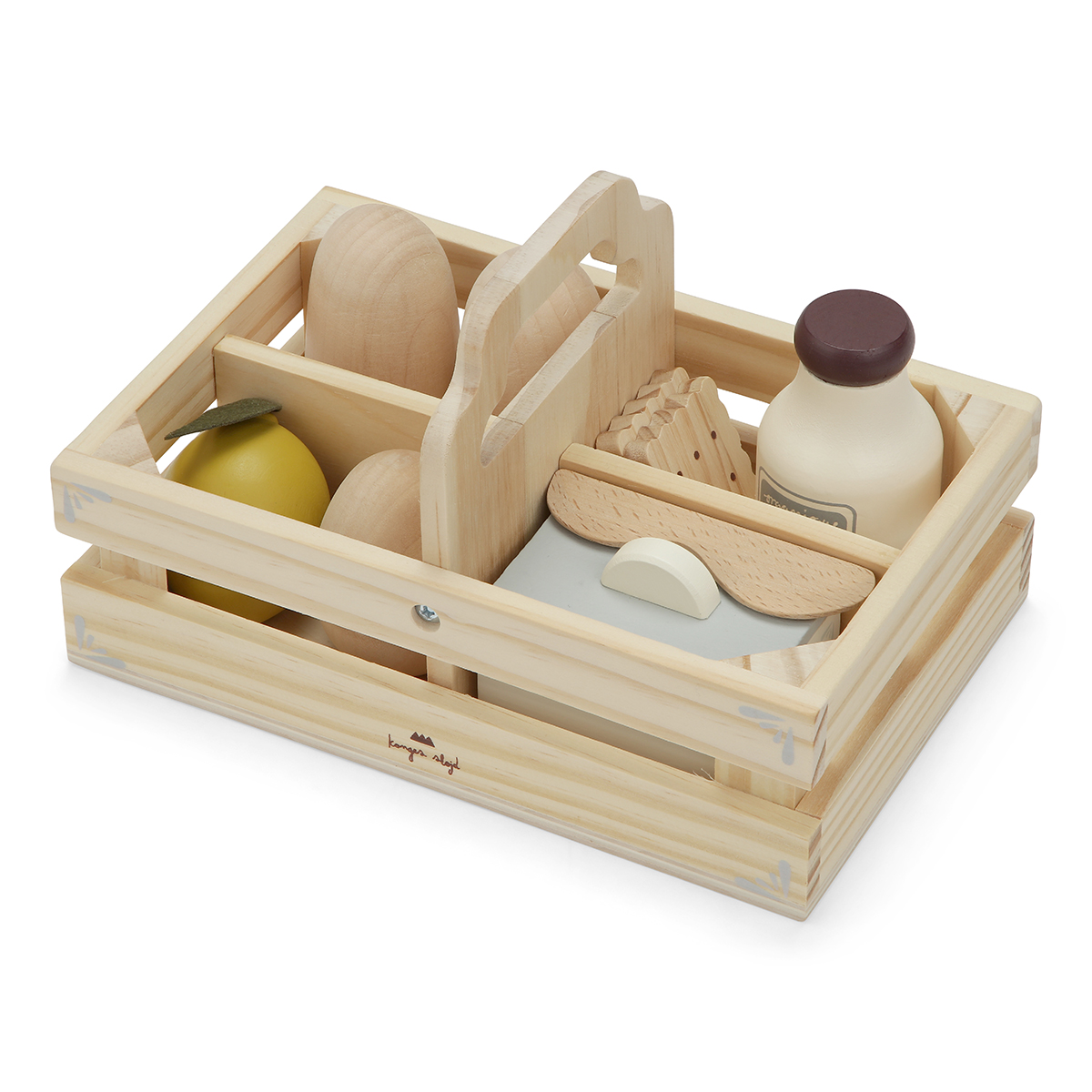 Die süße Konges Sløjd Holz-Lebensmittelset darf in der Kinderküche nicht fehlen. Mit Baguette, Butter, Milch und kleinen Keksen lässt sich ein köstliches Puppenessen kreieren. Ebenfalls enthalten sind ein Messer, eine Butterdose und eine kleine Zitrone. Das Set wird in einem süßen Holzkorb geliefert.