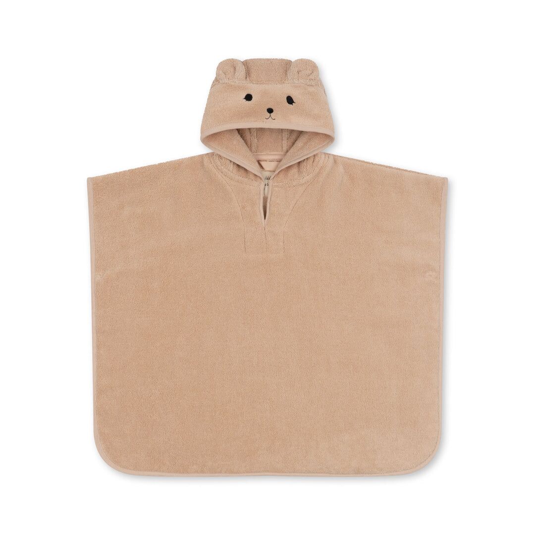 Was diesen Badeponcho besonders macht, ist seine Kapuze mit einem liebevoll gestickten Bärengesicht sowie niedlichen Bärohren an den Seiten. Diese Details machen ihn nicht nur zu einem kuscheligen, sondern auch zu einem visuell ansprechenden Begleiter für Ihre Kleinen.