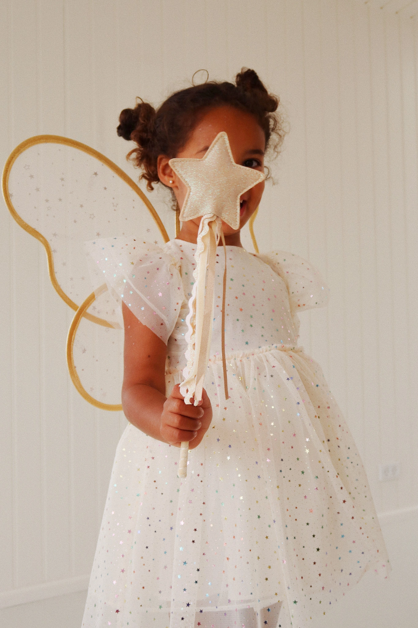 Die Flügel sind mit zwei dehnbaren Gummibändern ausgestattet, die sich bequem an die Größe des Kindes anpassen lassen und so für optimalen Tragekomfort sorgen. Diese Flexibilität garantiert, dass das Kostüm mit Ihrem Kind mitwächst und Teil vieler magischer Momente werden kann. Der Zauberstab mit seiner flatternden Bänder und der funkelnden Spitze rundet das zauberhafte Erscheinungsbild ab.