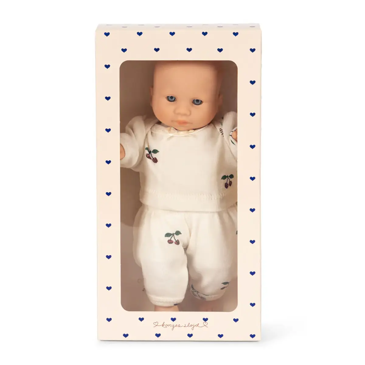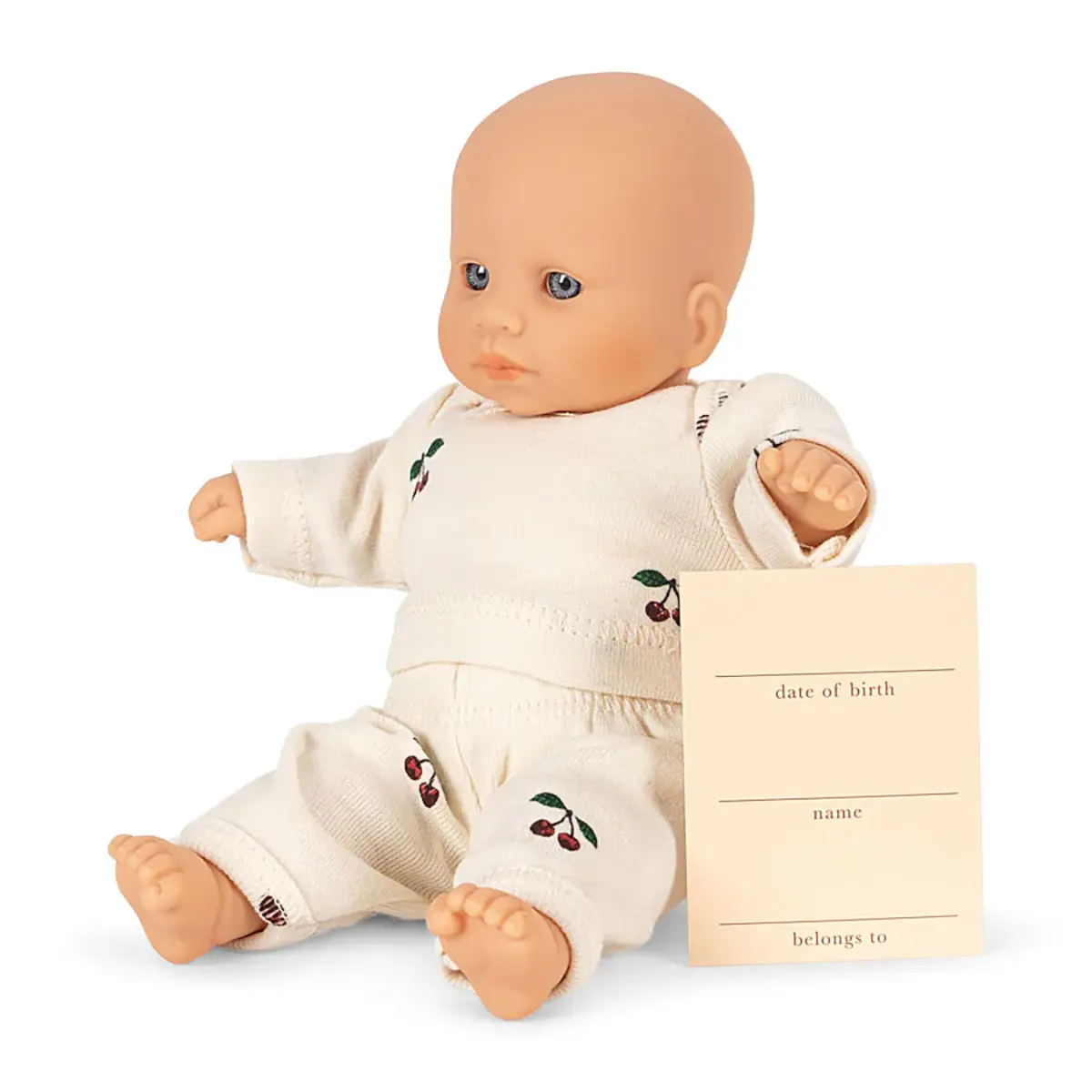 Der Körper besteht aus weichem Stoff mit süßem Kirschmuster, während der kleine Vinylkopf der Puppe einen klassischen Puppencharakter verleiht. Das zweiteilige Outfit aus Baumwolle ist angenehm weich und passt perfekt zum natürlichen Design. Durch die kompakte Form können Kinder die Puppe mühelos halten – ein wunderbarer Begleiter im Alltag.