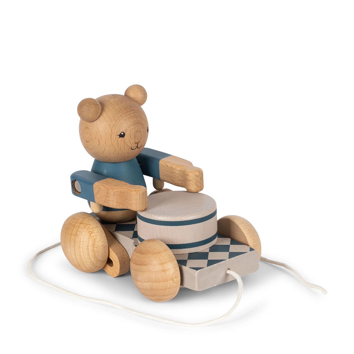 Mit Maßen von H: 11,5 cm, B: 9,8 cm und L: 13 cm ist der Nachziehbär ideal für kleine Hände gestaltet. Das Besondere an diesem Spielzeug ist die integrierte Trommel-Funktion: Sobald Ihr Kind an der Baumwollschnur zieht, beginnt der Bär zu trommeln, was für zusätzlichen Spielspaß sorgt und die Neugier weckt. Diese interaktive Komponente macht das Nachziehtier zu einem spannenden Begleiter bei jedem Abenteuer.