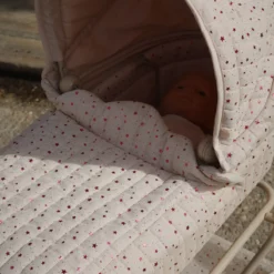 Vintage Konges Sløjd Puppenwagen mit vier großen Reifen aus EVA-Kunststoff für besonders gute Stabilität. Mit abgestepptem und bedrucktem Stoff und einer Matratze aus 100% Bio-Baumwolle. Design mit einem weichen Textilkorb für die Aufbewahrung unter dem Wagen. Der Rahmen besteht aus Metall mit weichen Schaumstoffgriffen. Der Kinderwagen wird komplett zusammengebaut geliefert und ist einfach zusammen- und aufzuklappen.