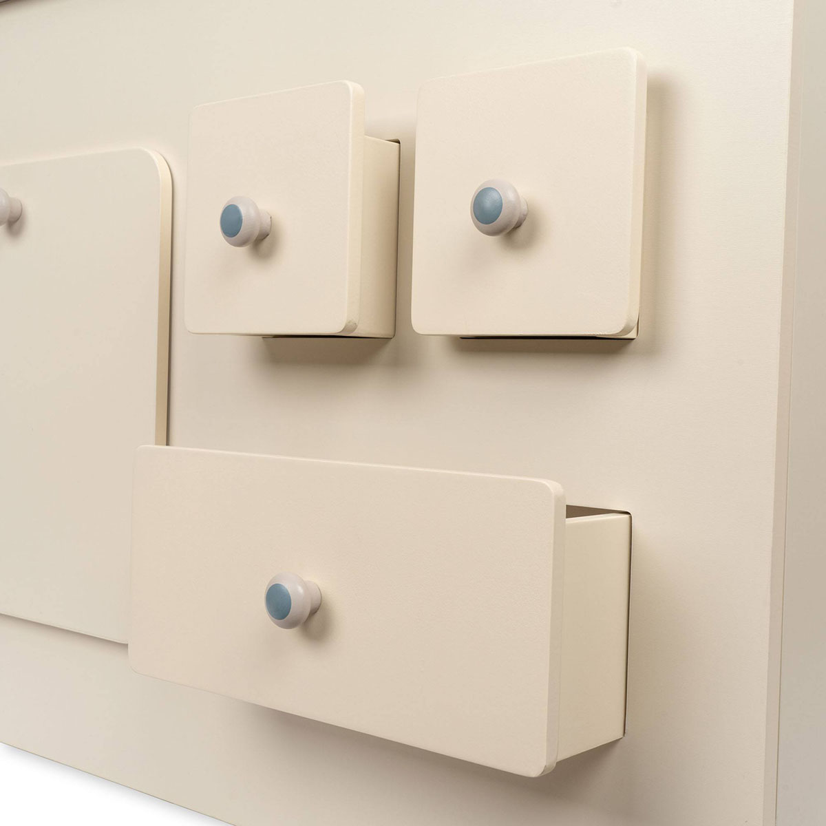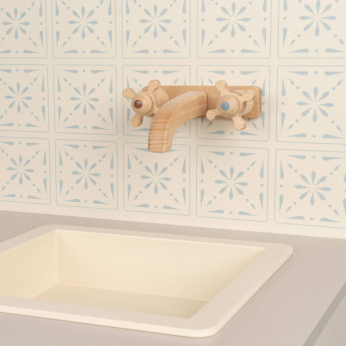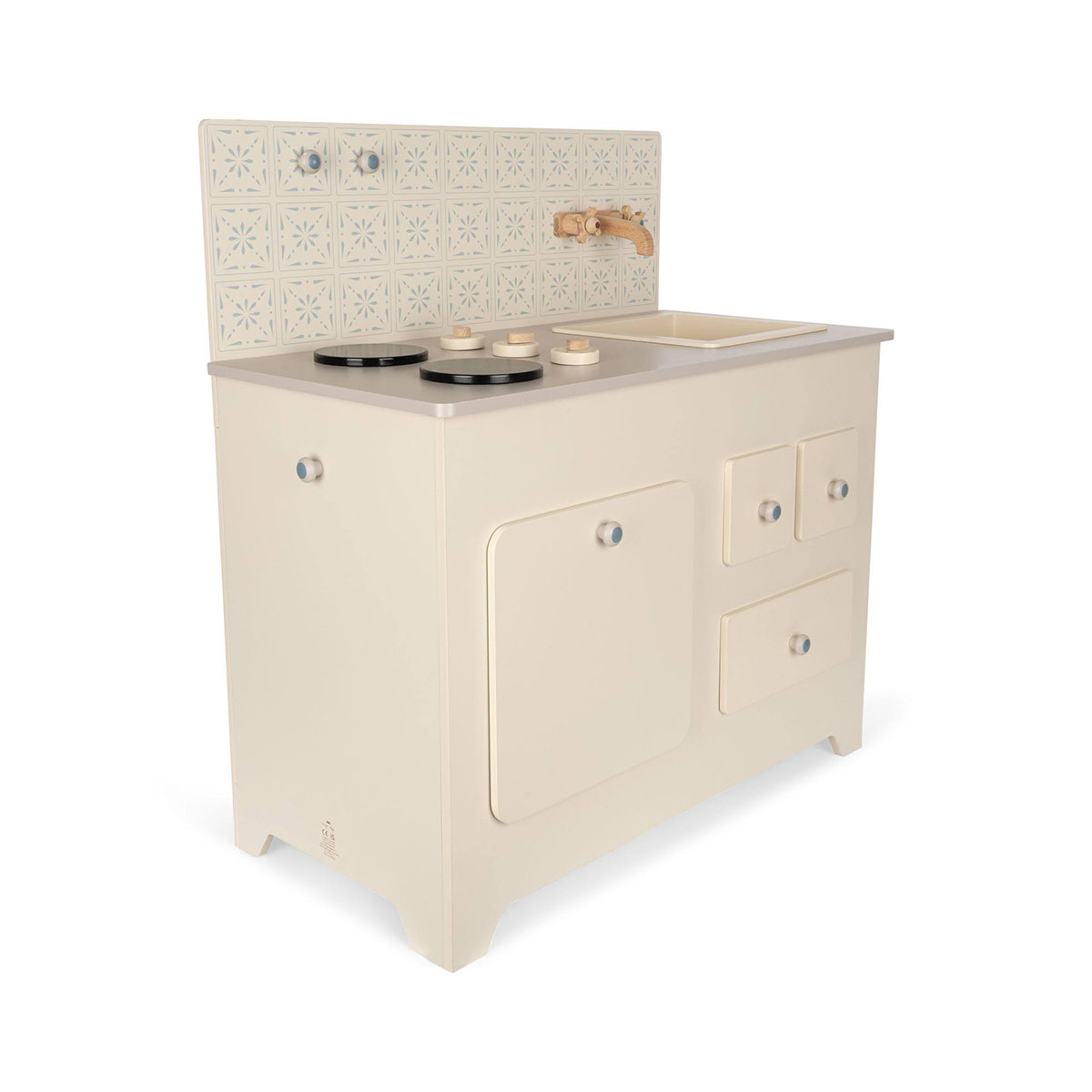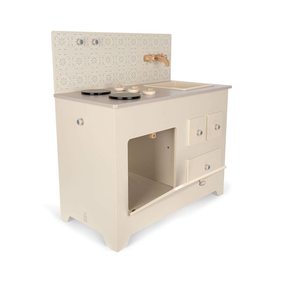 Die Holzküche verfügt über drei Schubladen, einen Backofen, einen Wasserhahn, eine Spüle, zwei Kochplatten und mehrere drehbare Knöpfe. Die Kinderküche wird aus Sicherheitsgründen mit anbringbaren Wandaufhängern geliefert.