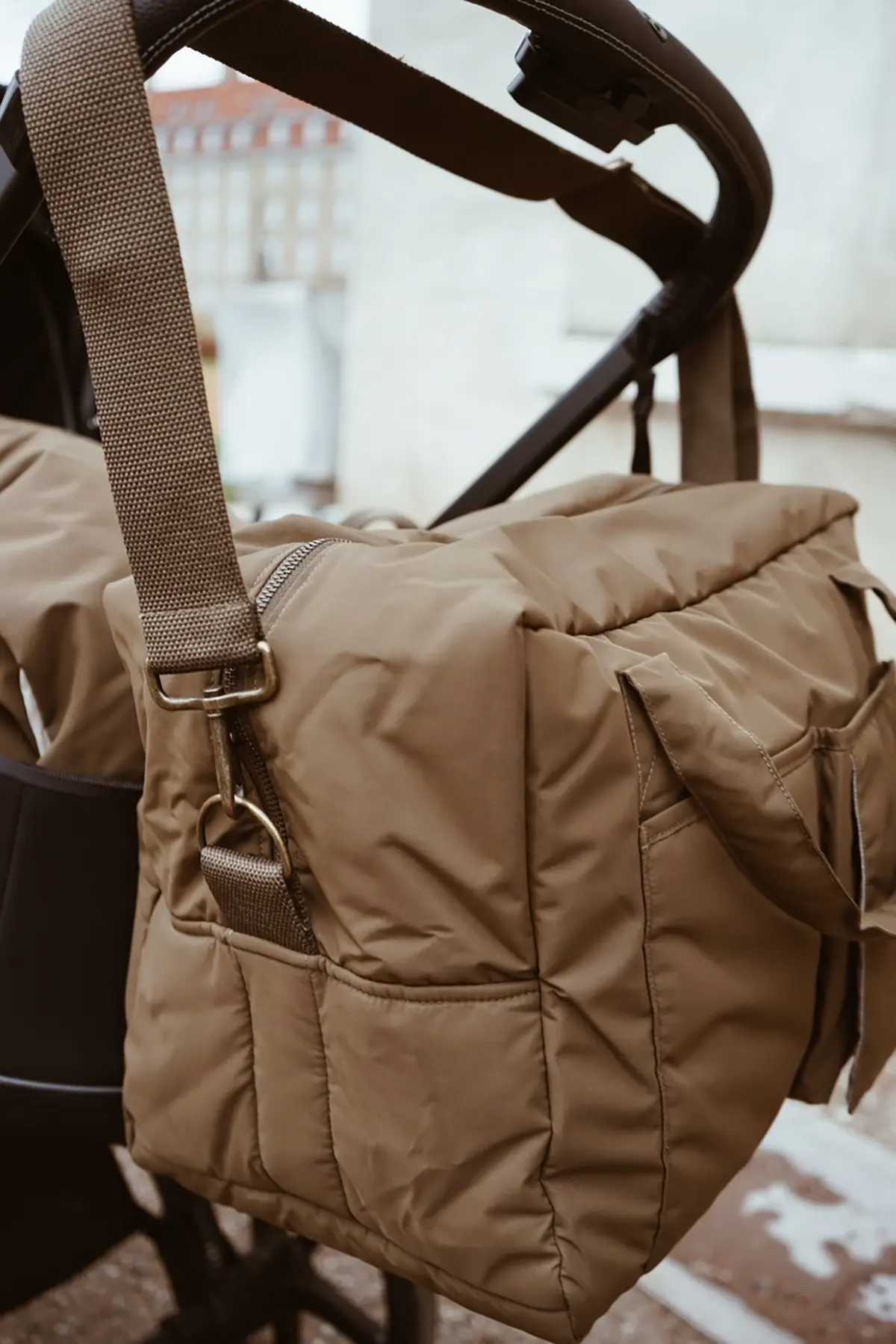 Weil die Tasche großzügig geschnitten ist, passt sie nicht nur zum Babyalltag, sondern auch gut zu Wochenendbesuchen, Autofahrten oder Tagen, an denen einfach mehr eingepackt werden muss. Sie wird mit einem Reißverschluss geschlossen und lässt sich durch die verstellbaren und abnehmbaren Träger flexibel tragen. An beiden Seiten sitzen D-Ringe, an denen sich Haken für den Kinderwagen befestigen lassen. Wichtig ist dabei: Die Haken sind nicht enthalten und müssen bei Bedarf separat bestellt werden.