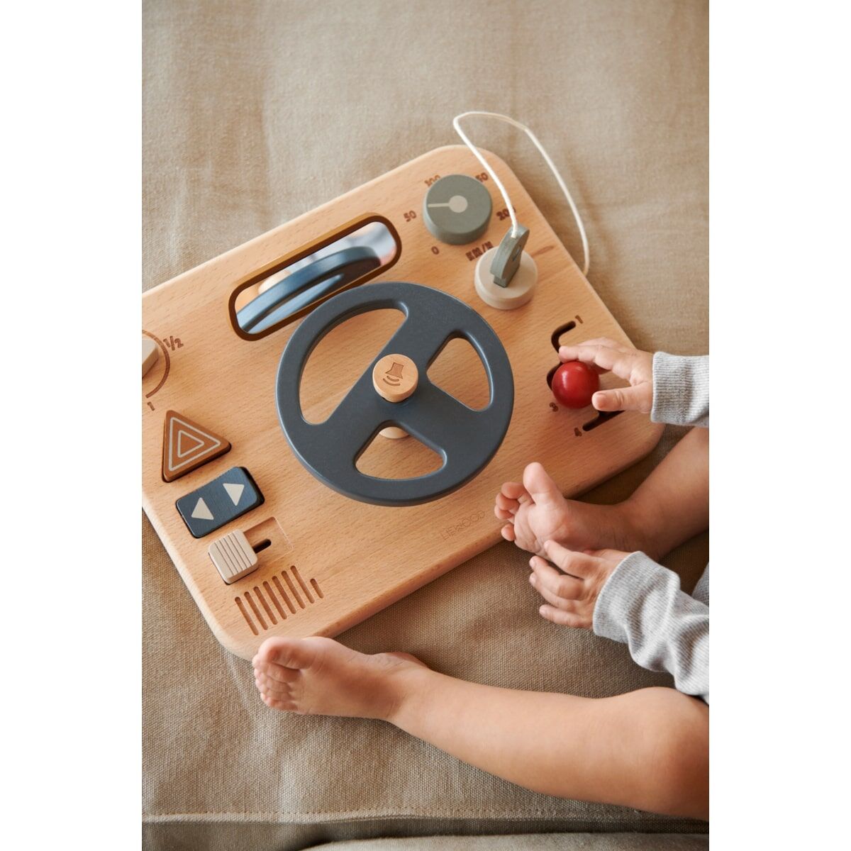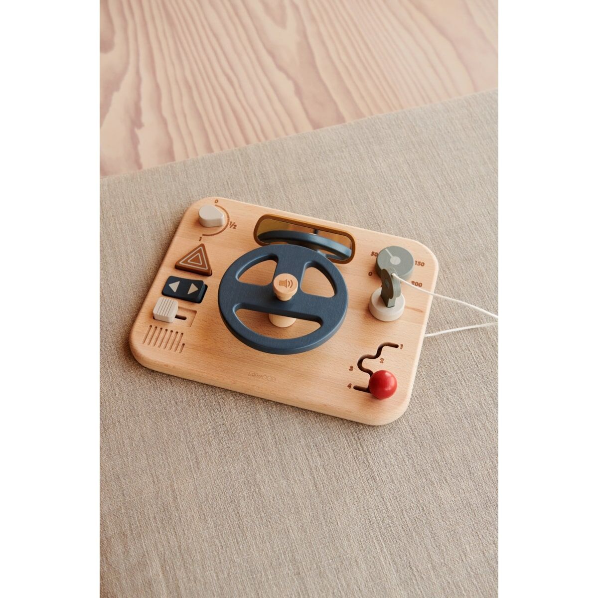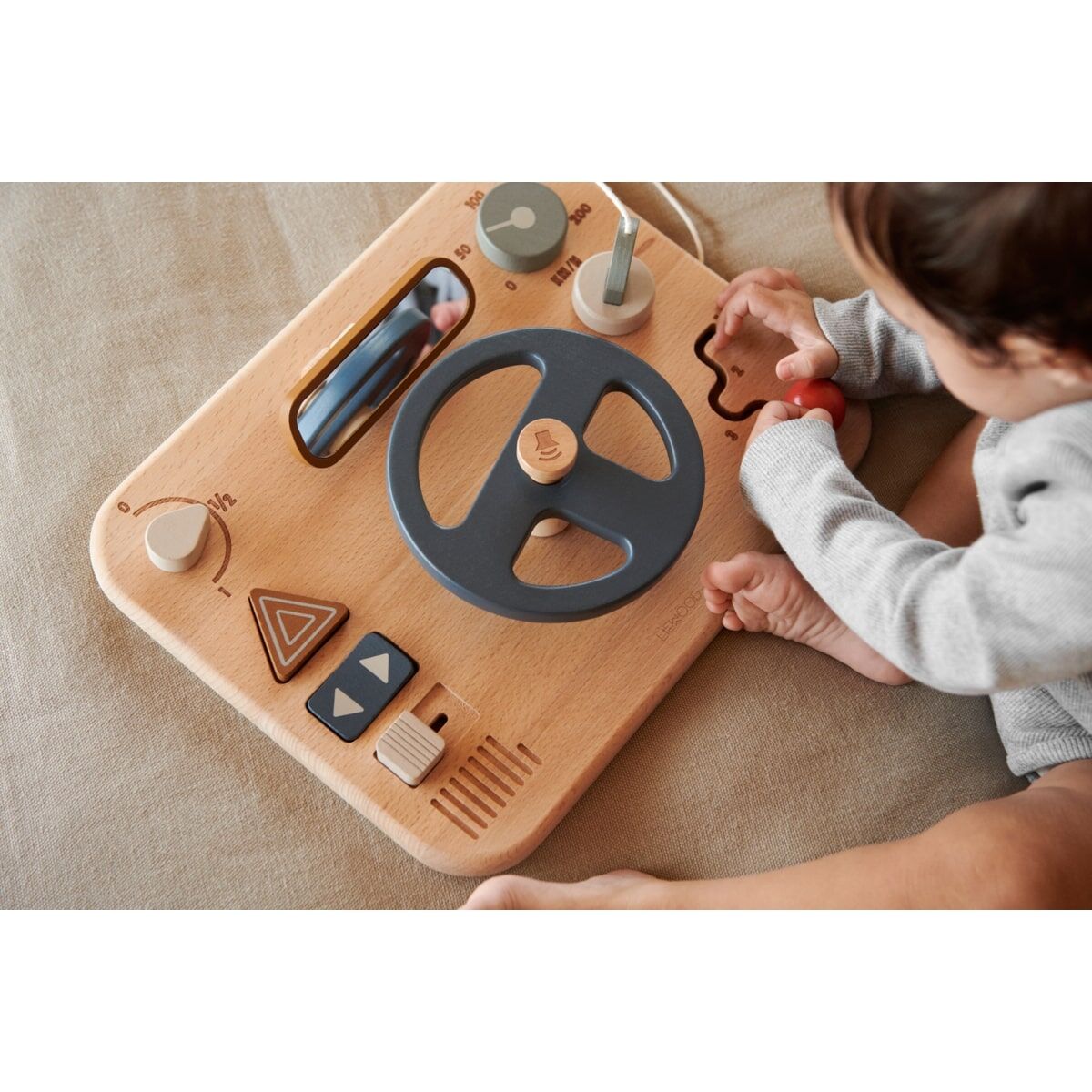 Die Liewood Aktivitätstafel Magnus aus Holz bietet sensorische Aktivitäten, die perfekt auf die Entwicklung von Kleinkindern abgestimmt sind. Zu den Funktionen gehören eine Gangschaltung, ein Drehschlüssel, ein echter Spiegeleffekt, eine Hupe mit Ton, ein Rad und vieles mehr. Es besteht zu 100 % aus Buchenholz und ist für Kinder ab 18 Monaten geeignet.