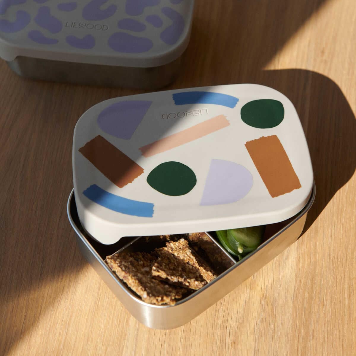 Leichte Liewood Arthur Lunchbox aus Edelstahl mit einem niedlichen Silikondeckel. Edelstahl eignet sich hervorragend zur Aufbewahrung von Lebensmitteln, da es weder Farbe noch Geruch vom Inhalt behält. Die Liewood Brotdose ist in drei praktische Fächer unterteilt.