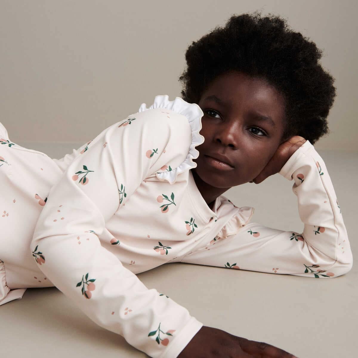 Der Liewood Kinder Badeanzug Sille aus recyceltem Polyester mit langen Ärmeln und Rüschen an den Schultern und der Taille ist perfekt, um sicher in der Sonne zu spielen.