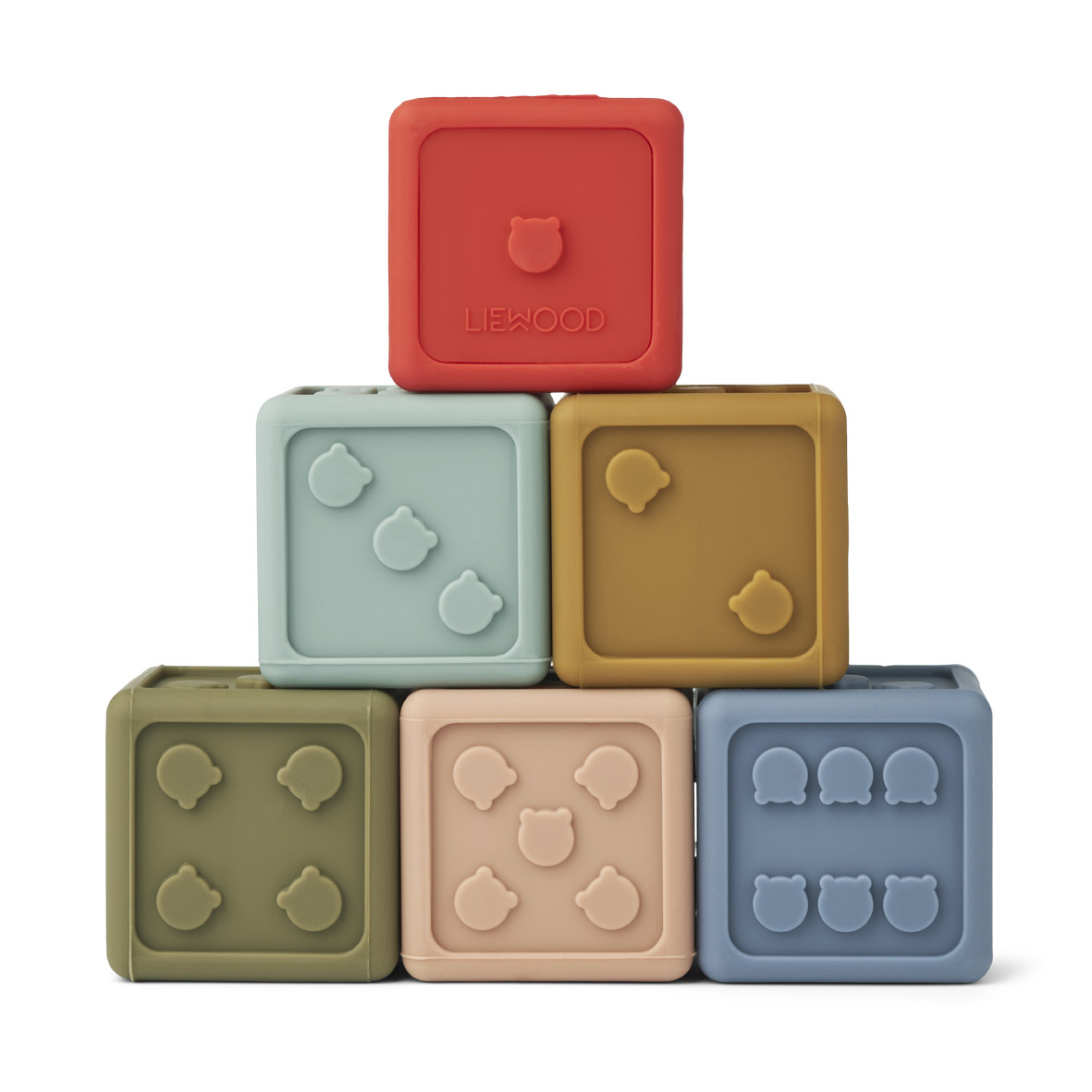Süsses 6er-Set Liewood Spielzeugwürfel Gloria aus Silikon. Die Zahlen sind als kleine süße Bären dargestellt. So wird das zählen lernen zu einem lustigen und niedlichen Spiel.