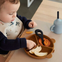 Der Liewood Stacy Silikon Menüteller mit Saugnapf hat eine dünne Silikonbasis, die an verschiedenen Oberflächen haftet, wodurch es für Kinder fast unmöglich ist, den Menüteller anzuheben oder umzukippen.