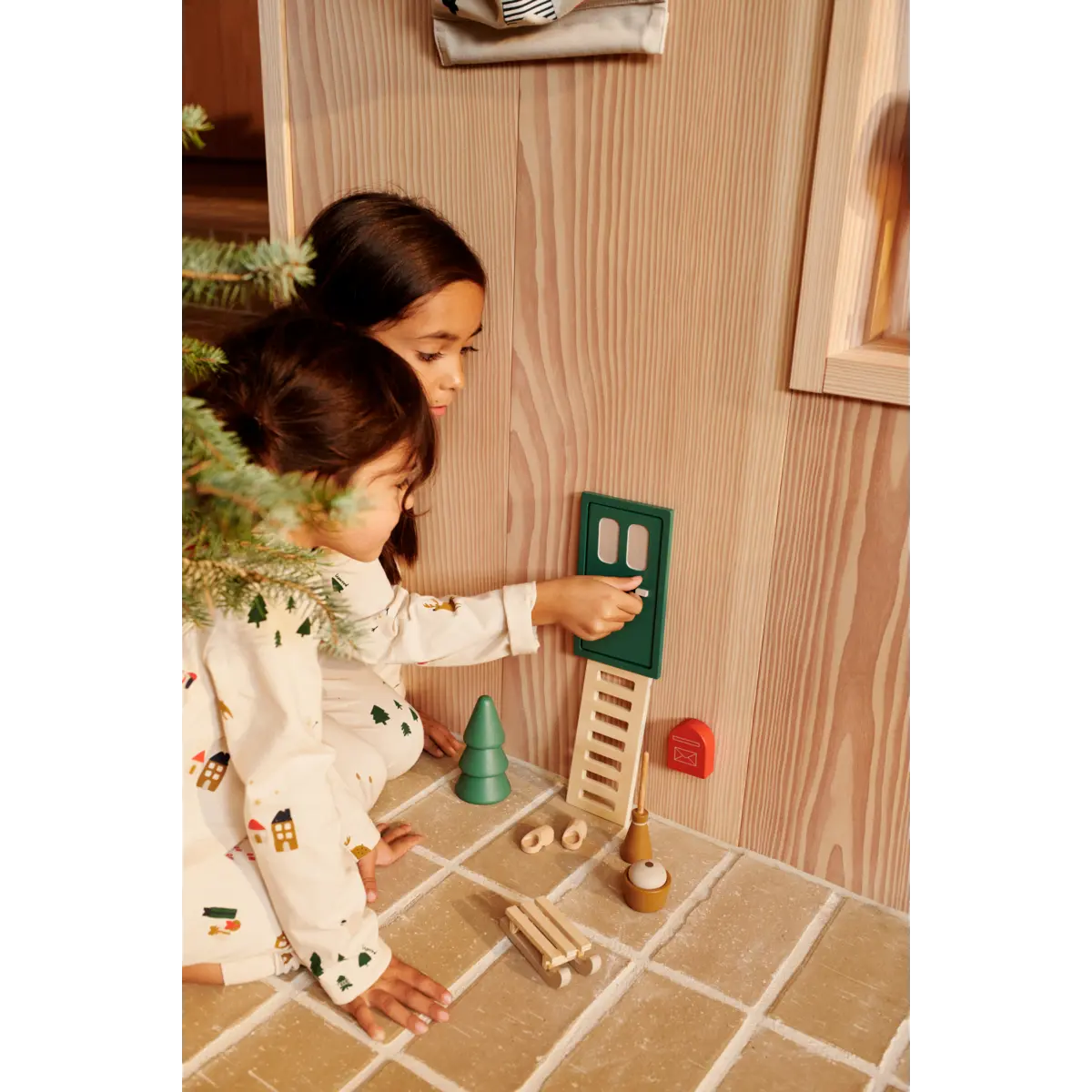 - Das Set enthält: Tür, Baum, Leiter, Briefkasten, Besen, Schlitten und Pantoffeln