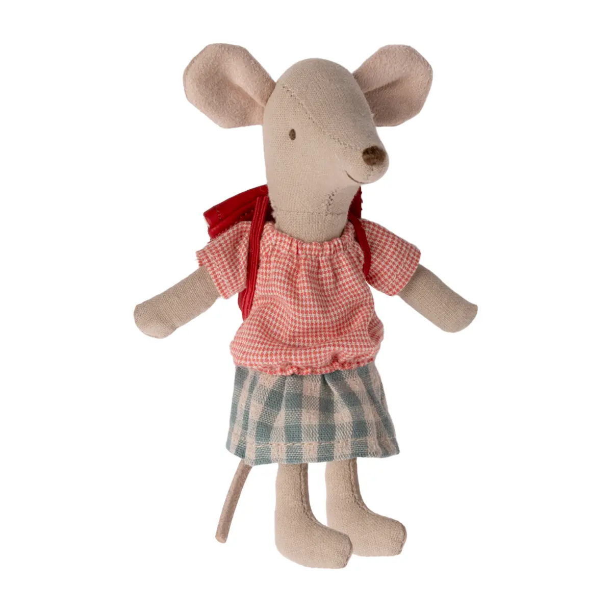 Die Maileg Big Sister Dreiradmaus ist für einen Tag im Kindergarten oder in der Schule angezogen, und trägt ihren Rucksack auf dem Rücken. Sie hat Magnete in ihren Händen, damit sie die Dreiradgriffe für die schnelle Fahrt fest halten kann.