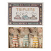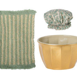 Rub a Dub Dub, da ist eine Maus in der Wanne. Die Maileg Big Sister Spa & Wellnessmaus wird mit ihrer Luffa- und Bürstenbürste sauber, aber ihre Ohren bleiben mit ihrer Duschhaube trocken. Sie ist eine findige kleine Dame, die für ihre Wanne eine süße, bemalte Metallschale verwendet.