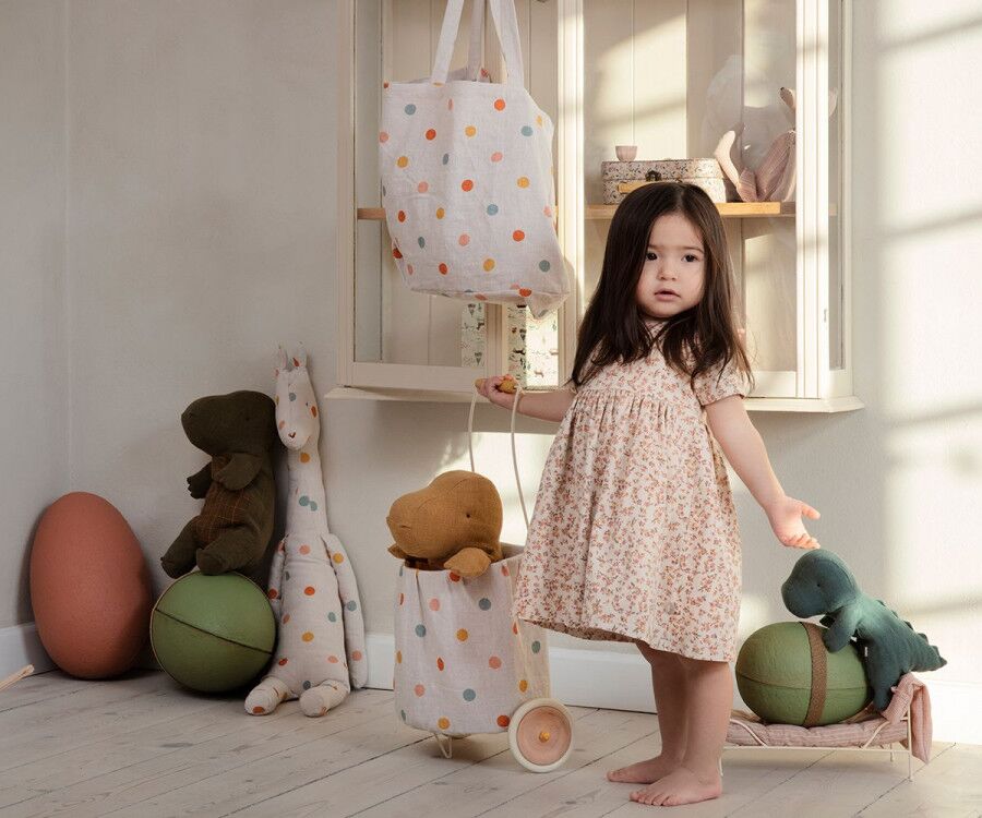 Der große Maileg Dino Gantosaurus ist aus einer weichen Mischung aus Ramie und Baumwolle hergestellt, der gestreifte Bauch besteht aus einer Leinen-/Baumwollmischung.