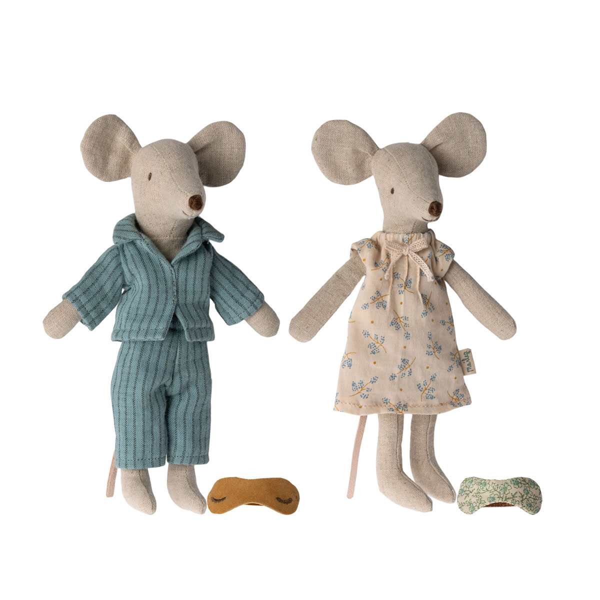 Mit ihren stilvollen Nachthemden und den entzückenden Augenmasken, sind Mama und Papa Mäuse das Bild von Gemütlichkeit und Eleganz. Sie repräsentieren die kleinen Momente der Ruhe und Entspannung, die in der geschäftigen Welt oft verloren gehen.