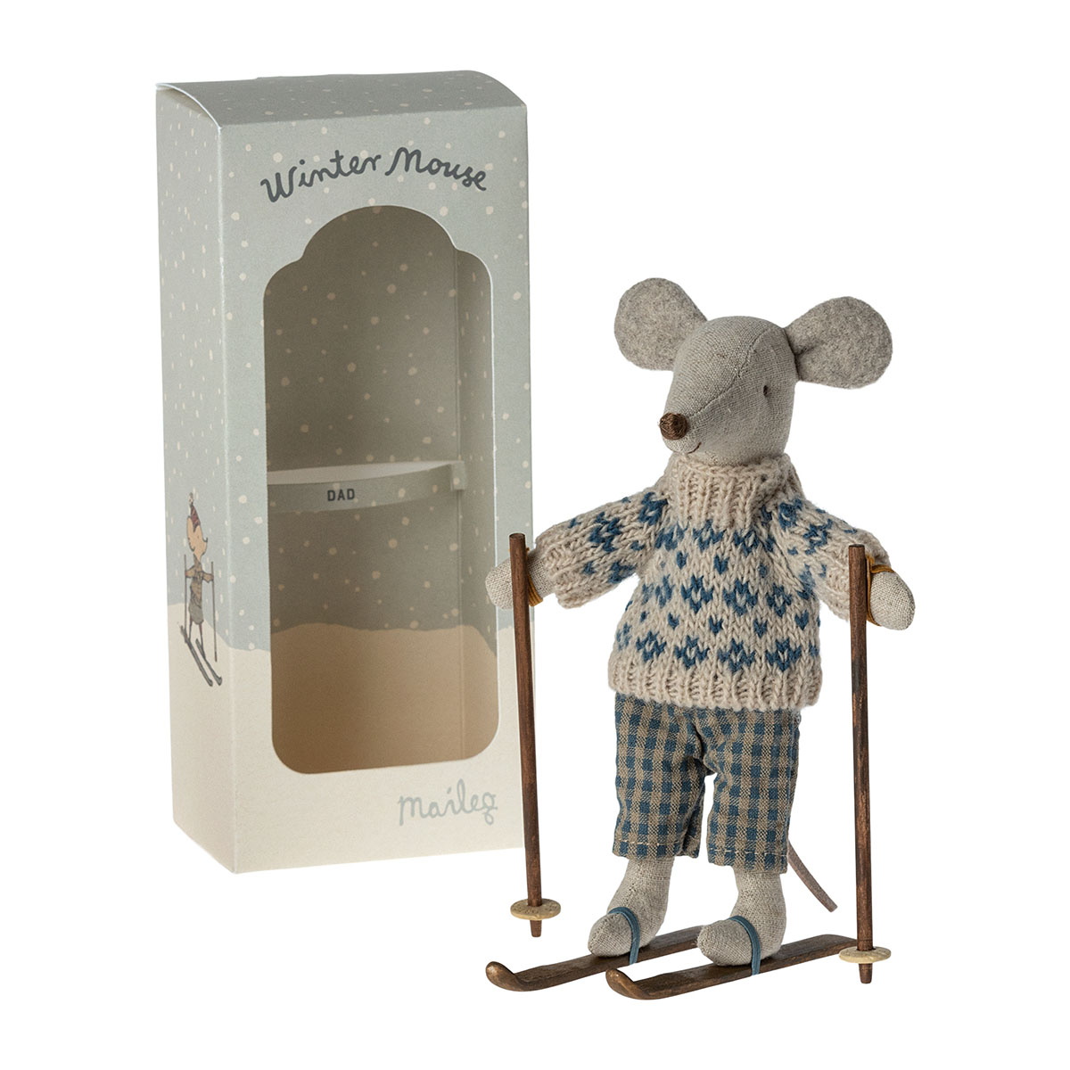 Jedes Set enthält eine Maileg Papa Wintermaus, die mit einem warmen Strickpullover, einer Hose und einem Paar Ski und Stöcken bekleidet ist. Ein lustiges Detail sind die Ohren die aussehen, als würde die Maus Ohrenwärmer tragen.