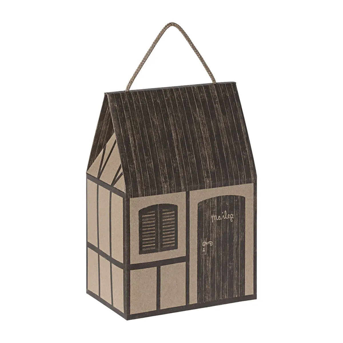 Eine Maileg Papiertüte in Form eines kleinen Hauses mit Tür und Fenster. Dies ist die perfekte Geschenkverpackung für jedes kleine Maileg-Geschenk und stellt sicher, dass die Geschichte beginnt, bevor das Geschenk geöffnet wird.
