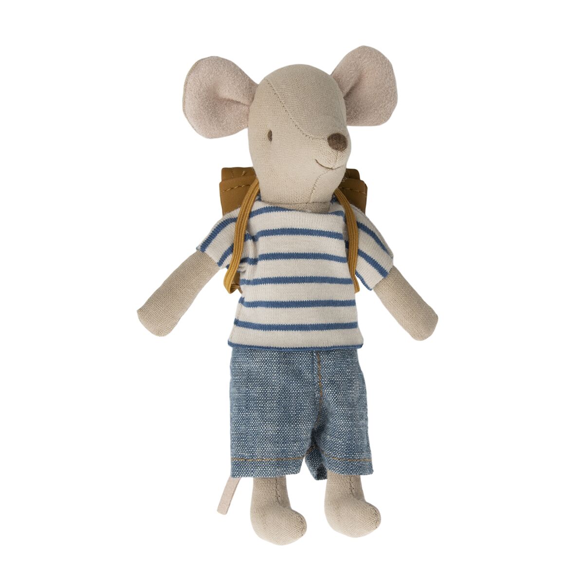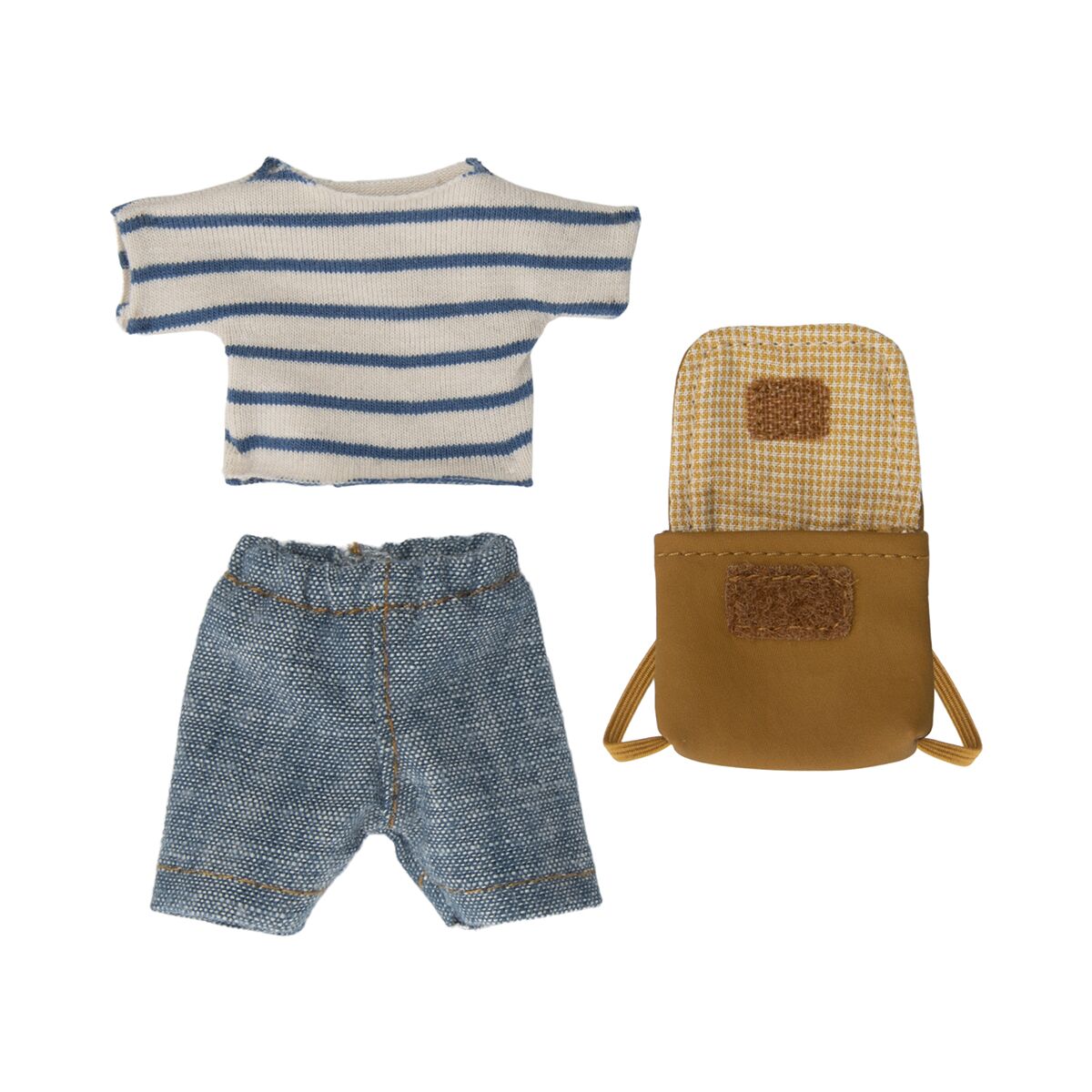 Ein lockeres Maileg Puppenkleidungs-Set für Mäuse in der Größe große Schwester / großer Bruder Maus. Dieses Set enthält eine kurze Hose, ein T-Shirt und einen Rucksack.