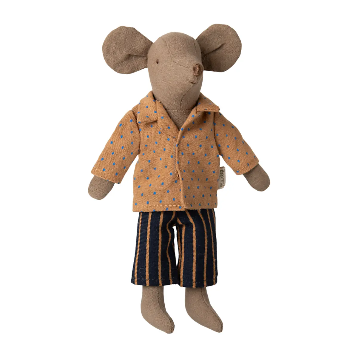 Am frühen Morgen zieht Papa Maus sein neues Outfit an. Das gepunktete Hemd sitzt perfekt, und die gestreifte Hose verleiht ihm einen modernen, doch gemütlichen Look. Draußen im Garten helfen die Kinder beim Pflanzen neuer Blumen, während Mama Maus den Tee serviert. „Heute wird ein schöner Tag“, denkt er und lächelt, als der Wind sanft durch die Baumwipfel weht. Am Abend hängt er sein Hemd ordentlich über den Stuhl – zufrieden nach einem Tag voller kleiner, glücklicher Momente in der Maileg-Welt.
