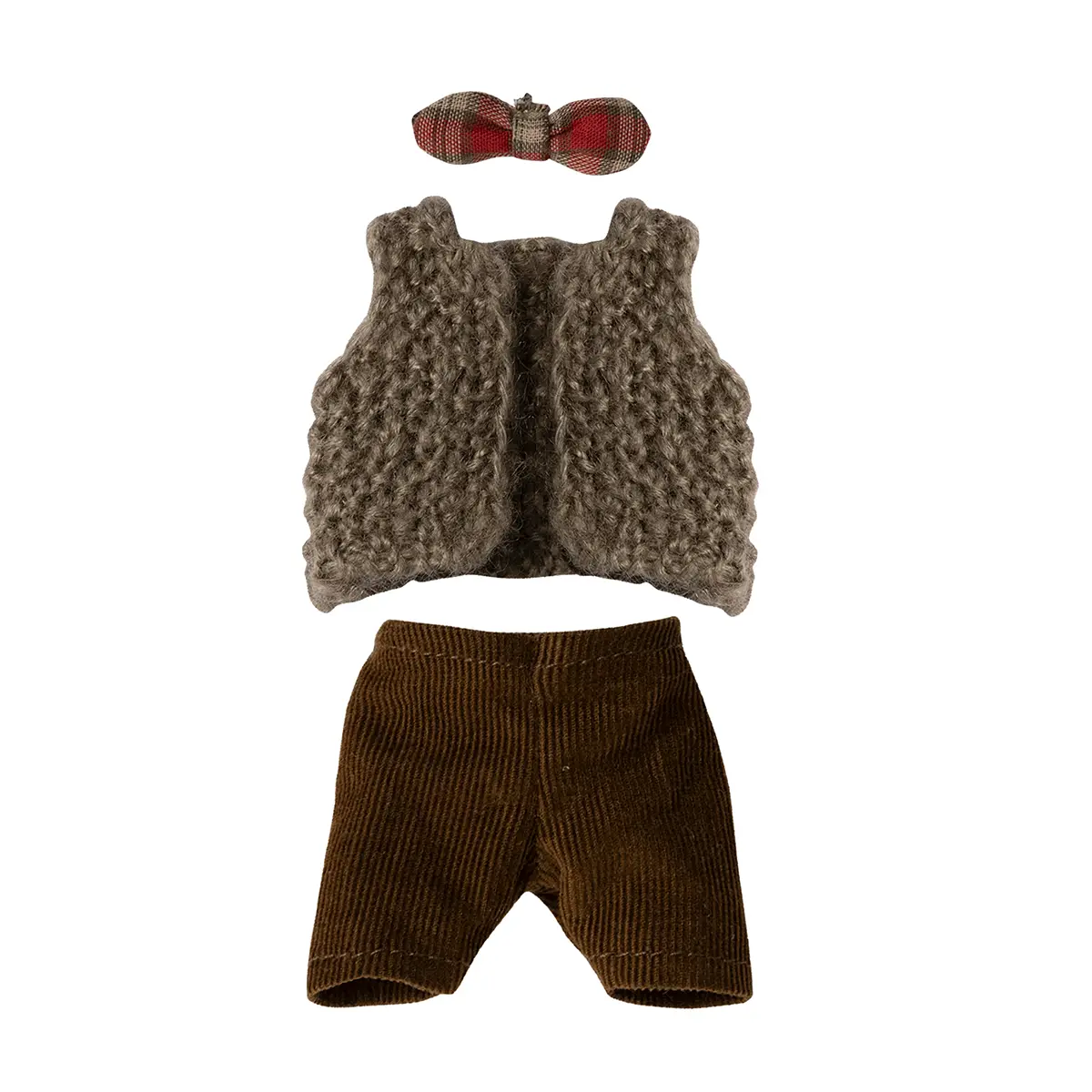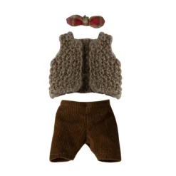 Das Maileg Puppenkleidungs-Set beinhaltet eine Weste, eine Hose und eine Fliege für Opa oder Papa Maus.