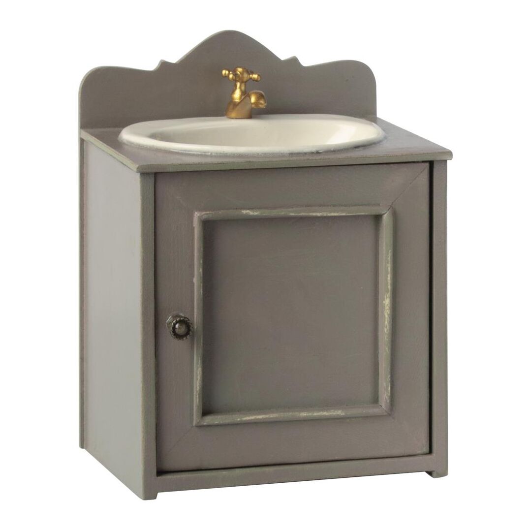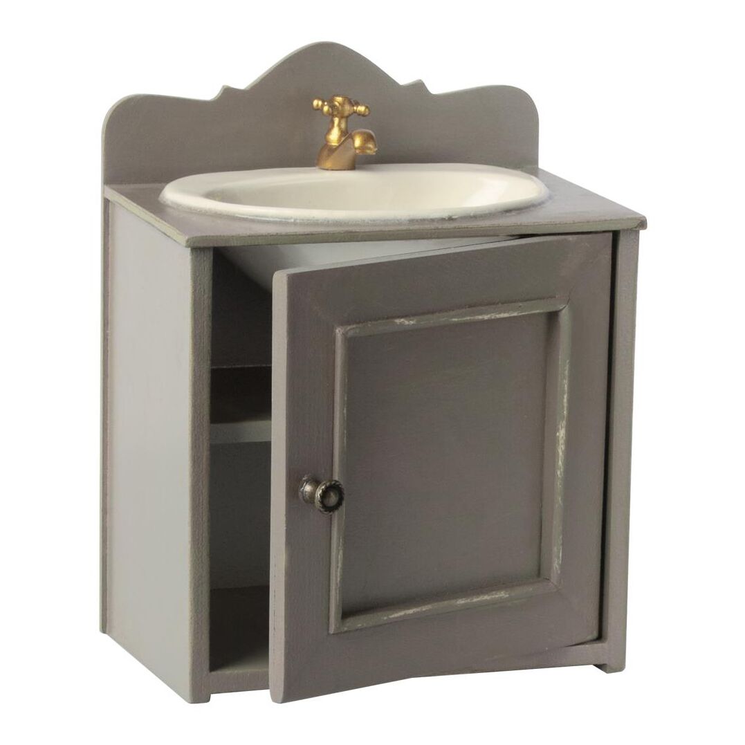 Eine schöner Vintage Maileg Waschtisch mit einem goldenen Wasserhahn. Das Waschbecken befindet sich in einem Holzschrank, in dem Sie die persönlichen Sachen Ihrer Mäuse und Hasen aufbewahren können. Der Waschtisch passt perfekt in das Maileg Badezimmer & Puppenhaus.