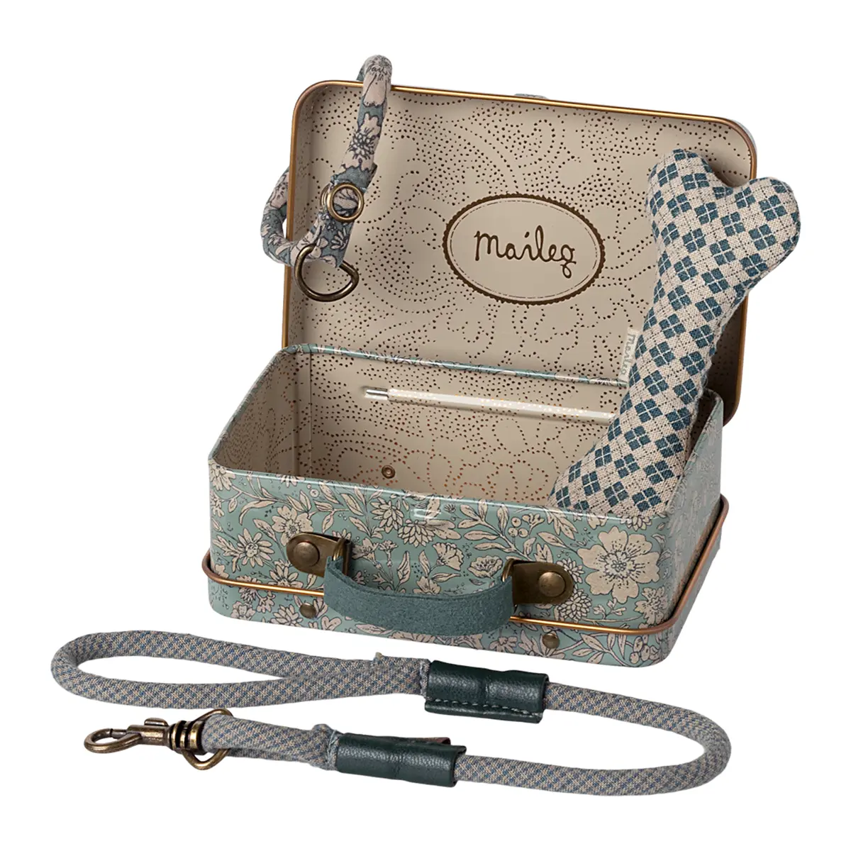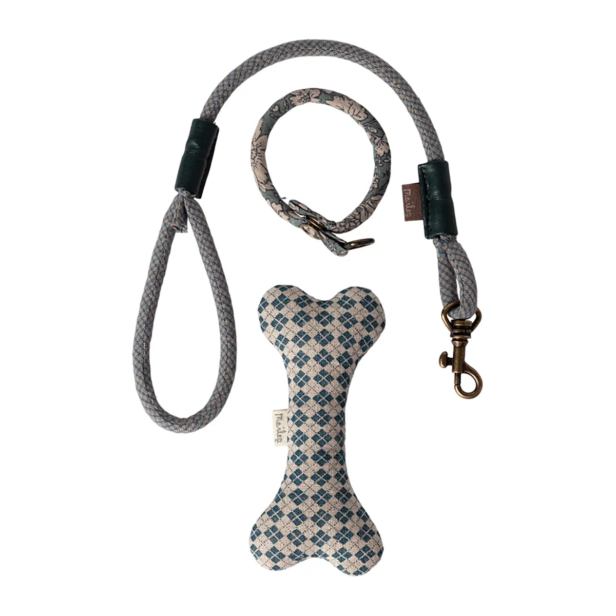 Das Maileg Welpen Zubehör ist das perfekte Set für alle kleinen Tierliebhaber, die ihren Maileg-Hund rundum versorgen möchten. In diesem liebevoll zusammengestellten Set findest Du alles, was Dein Plüschhund braucht: einen Knochen zum Spielen, ein Halsband und eine Leine – alles sicher und stilvoll in einem kleinen Metallkoffer mit charakteristischem Maileg-Druck verpackt.
