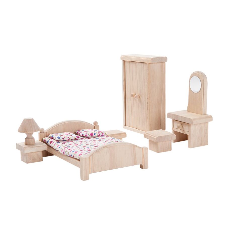 Das PlanToys Schlafzimmer Classic Puppenhausmöbel-Set besteht aus: einem Doppelbett mit passender Bettwäsche, einem Kleiderschrank, einem Schminktisch mit Schublade und Spiegel, einem Hocker, 2 Nachtischen sowie einer Nachtischlampe.
