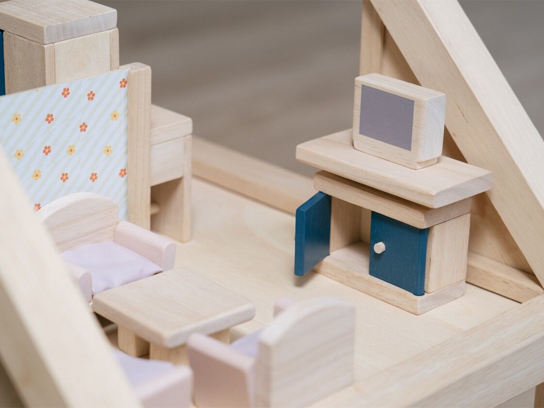Das PlanToys Wohnzimmer „Orchard“ besteht aus einer Couch, zwei Sesseln, einem Wohnzimmertisch einem TV-Schrank und einer Stehlampe. Dieses Puppenmöbelset passt zu allen Puppenhäusern von PlanToys.