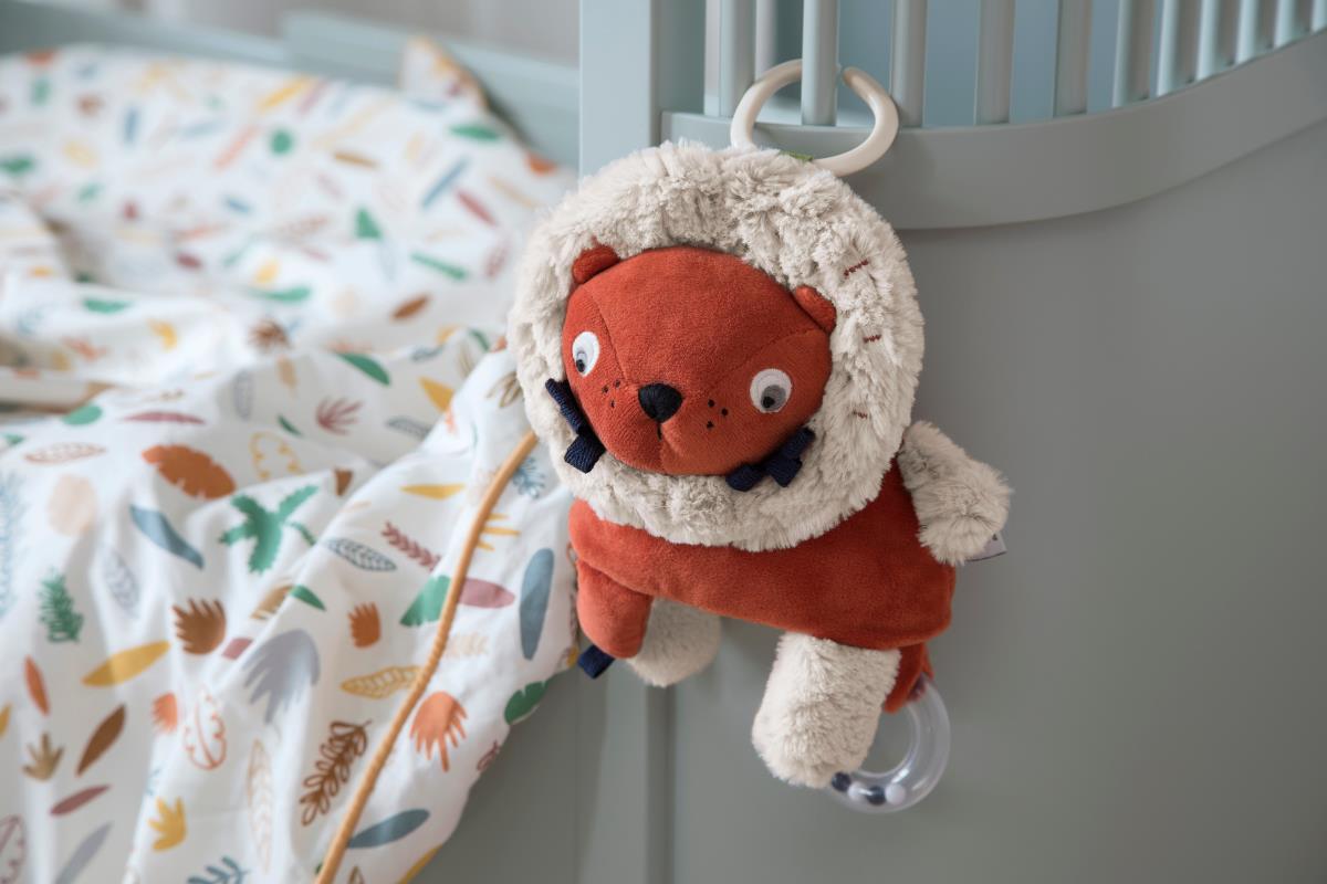 Mit Knisterpapier in der Mähne und einem lustigen Rasselring mit Kugeln kann der Löwe Lee das kleine Kind unterhalten. Unten am Bauch verfügt Lee über einen kleinen sicheren Babyspiegel, damit das Kind sich selbst kennenlernen kann – hierdurch kann es spielerisch sein Gesicht, die Bewegungen und die Mimik entdecken. Dies hilft dabei, die Fähigkeiten des Kindes zu stimulieren und zu entwickeln und wird mit Sicherheit für Freude und Lacher sorgen. Am Rücken des Löwen ist ein C-förmiger Ring angebracht, dank dem er am Verdeck des Kinderwagens, des Buggys oder des Autositzes befestigt werden kann, um die Sinne des Kindes zu stimulieren und zu aktivieren. Der Kunststoffring ist selbstverständlich frei von BPA, Phthalaten, PFOA, PFOS und Formamid.