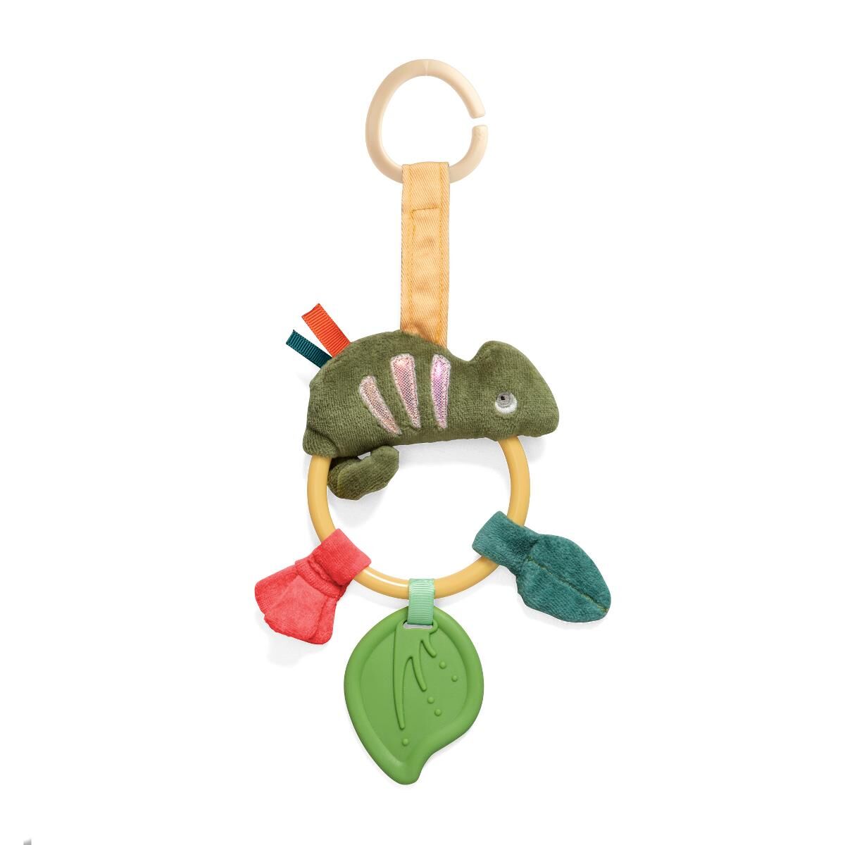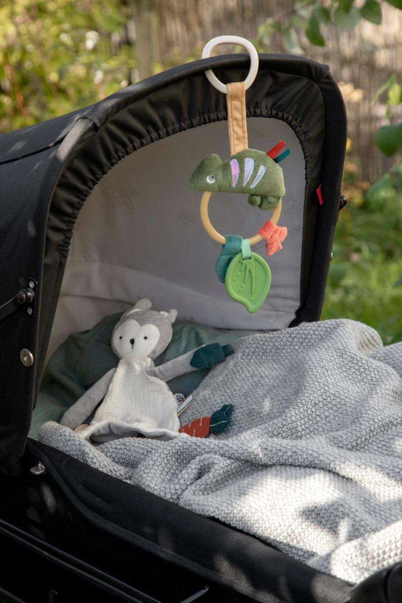 Farbenfroher und lustiger Sebra Aktivitätsring „Carley das Chamäleon“ zum Aufhängen. Carley sitzt auf einem Ring, damit das kleine Kind das lustige Tier genau studieren kann. Auf dem Ring befindet sich ein Beißring in Form eines Blattes, und streifenförmige Tags zum Befühlen mit Knisterpapier sorgen dafür, dass es Spaß macht, nach Carley zu greifen. Auf dem Rücken hat das Chamäleon einen C-förmigen Ring, mit dem es am Sitz eines Kinderwagens, Buggys oder Autositzes befestigt werden kann, um die Sinne des Kindes während des Transports zu stimulieren und zu aktivieren.