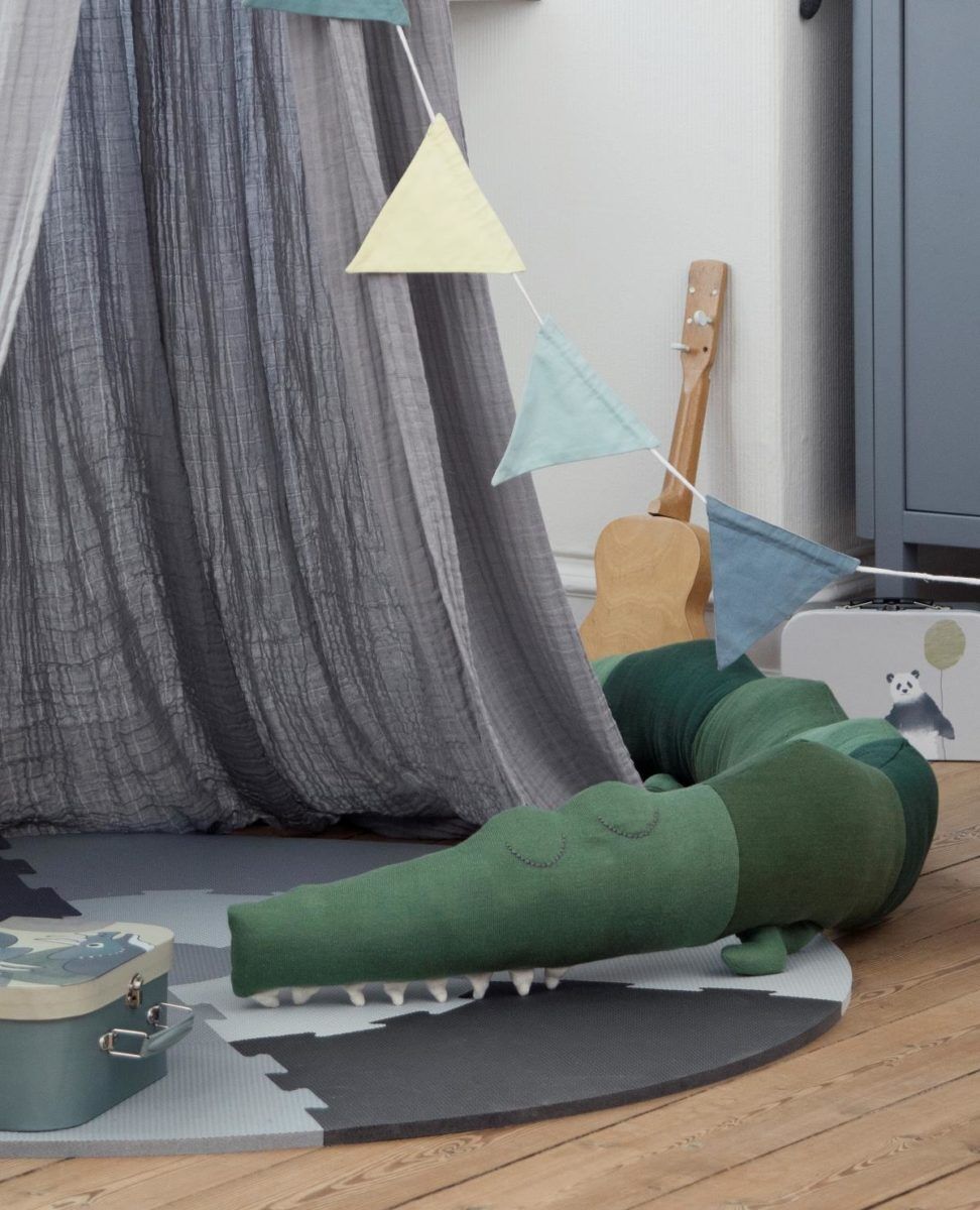 Der Baldachin kann einfach an der Decke befestigt und flexibel positioniert werden. Über dem Bett sorgt er für einen geschützten Schlafplatz, während er in einer Spielecke eine behagliche Höhle entstehen lässt. Am Metallbügel im Inneren lässt sich zusätzlich ein Mobile oder kleines Spielzeug befestigen, um Babys und Kleinkinder sanft zu unterhalten.