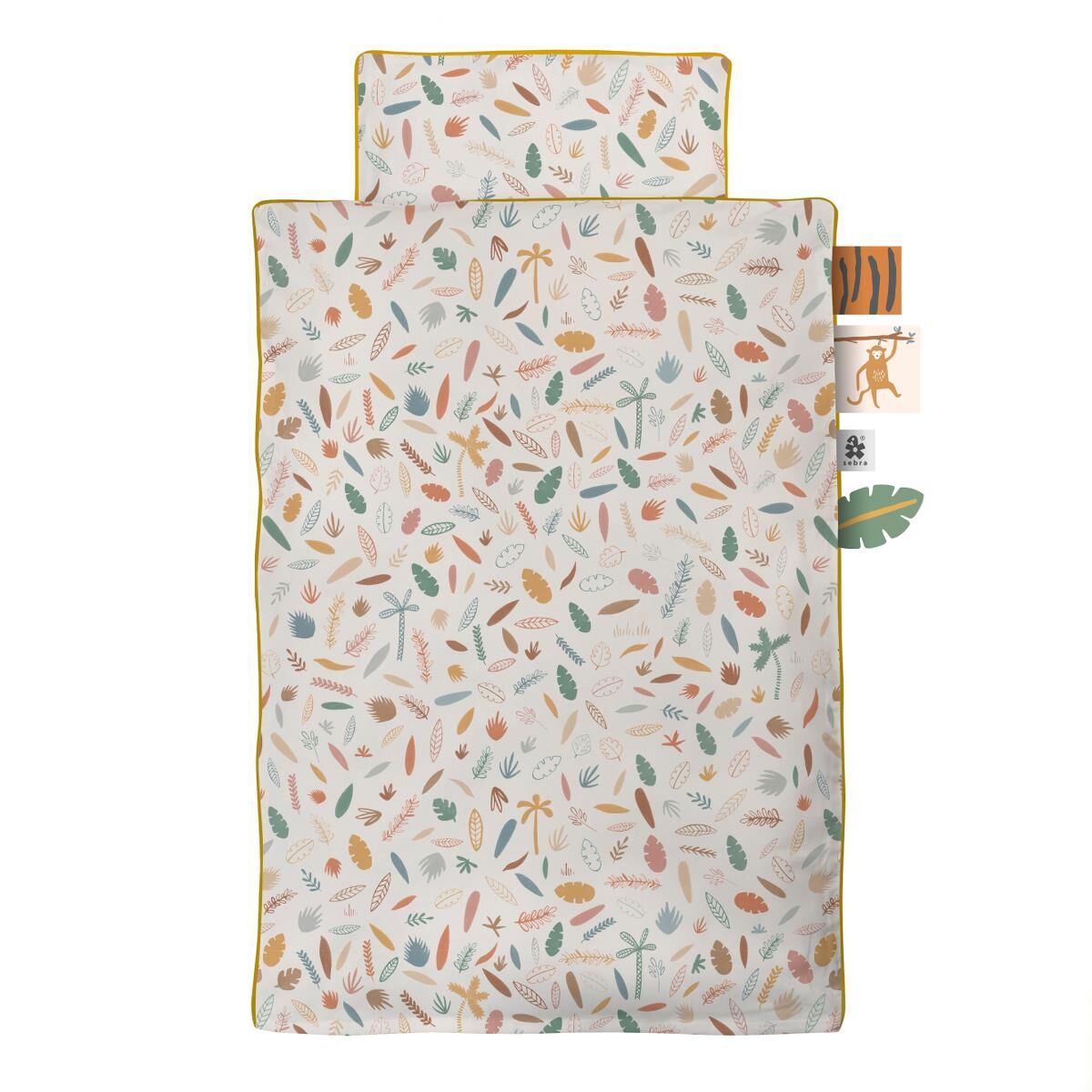 Auf dem Bettbezug sind vier Kuscheltücher aufgenäht, von denen eine die Form eines Blattes hat und die Bettwäsche als liebevolles Zusatzdetail mit einem currygelben Besatz versehen ist.