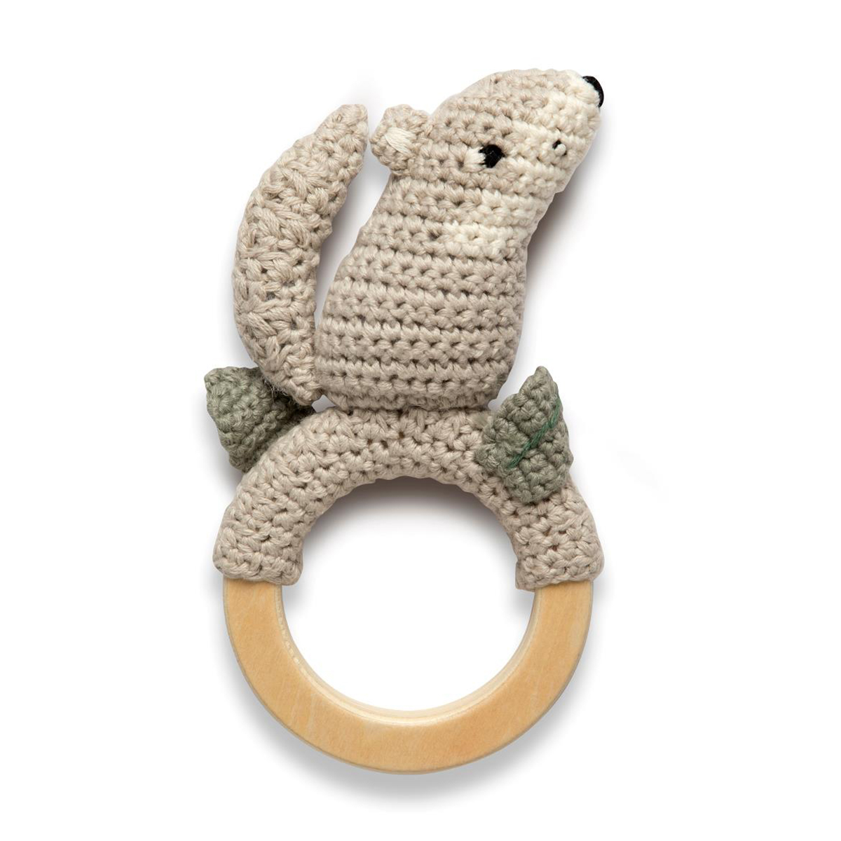 - Dank dem Holzring ist es für das Kind leicht, die Rassel in der Hand zu halten.