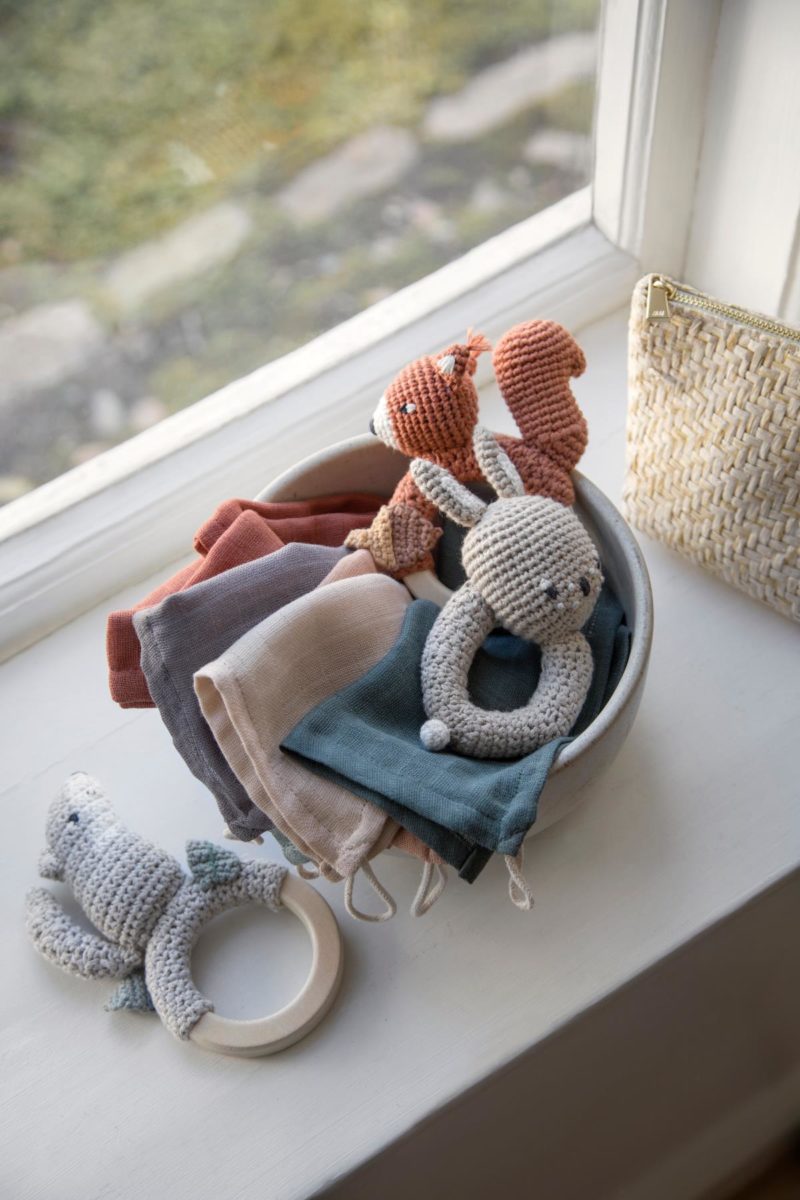 Die Sebra Häkel-Rassel „Moon der Wolf“ in der Form eines kleinen Wolfs wird von Hand und aus Bio-Baumwolle gefertigt. Im Inneren befinden sich Kugeln, die ein Geräusch machen, wenn die Rassel geschüttelt wird. Die Rassel ist zudem mit weichem, recyceltem Polyester gefüllt, welches sicher in einem kleinen Stoffbeutel eingeschlossen ist, wodurch verhindert wird, dass die Füllung zwischen dem Garn hervorquellen kann. Moon ist an einem Holzring befestigt, der zur Hälfte von Häkelmaterial bedeckt ist, sodass der Ring wie die Beine des Wolfs aussieht.