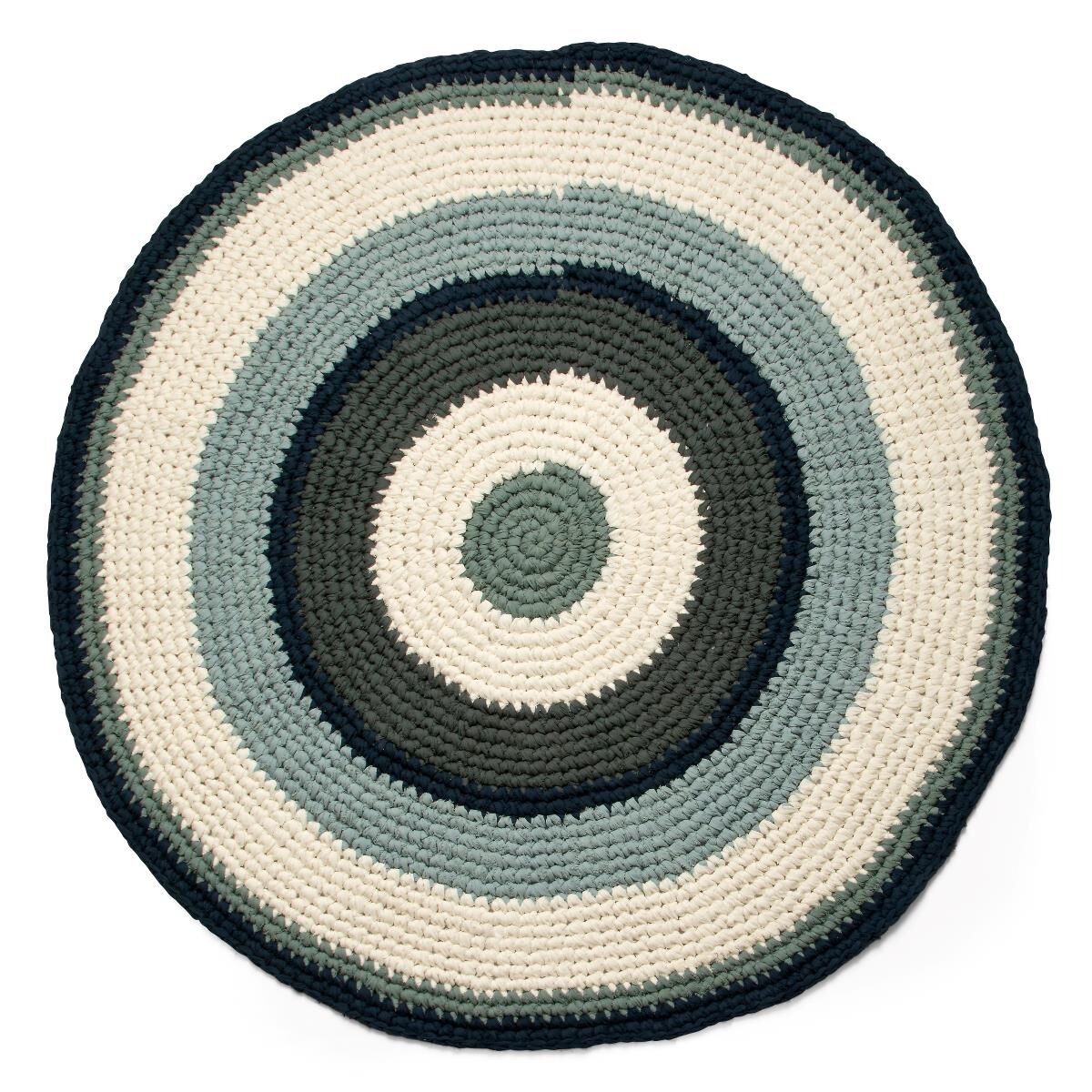 Schöner runder Sebra Häkelteppich, der aus mehreren bunten Ringen in blauen, weißen und grünen Farbtönen besteht. Der Sebra Teppich hat einen Durchmesser von 120cmund ist ideal als Unterlage für kleine nackte Füße, die am Morgen aus dem Bett steigen, oder um nachmittags beim Puzzlespiel als Spielteppich zu dienen. Der Teppich kann sowohl im Kinderzimmer, im Wohnzimmer als auch im Eingangsbereich zum Einsatz kommen, oder an einem anderen Ort, an dem Sie einen schönen Teppich benötigen. Der Teppich wurde in Dänemark entworfen und ist handgefertigt, weshalb jeder Teppich einzigartig ist und über einen ganz eigenen Charme verfügt.