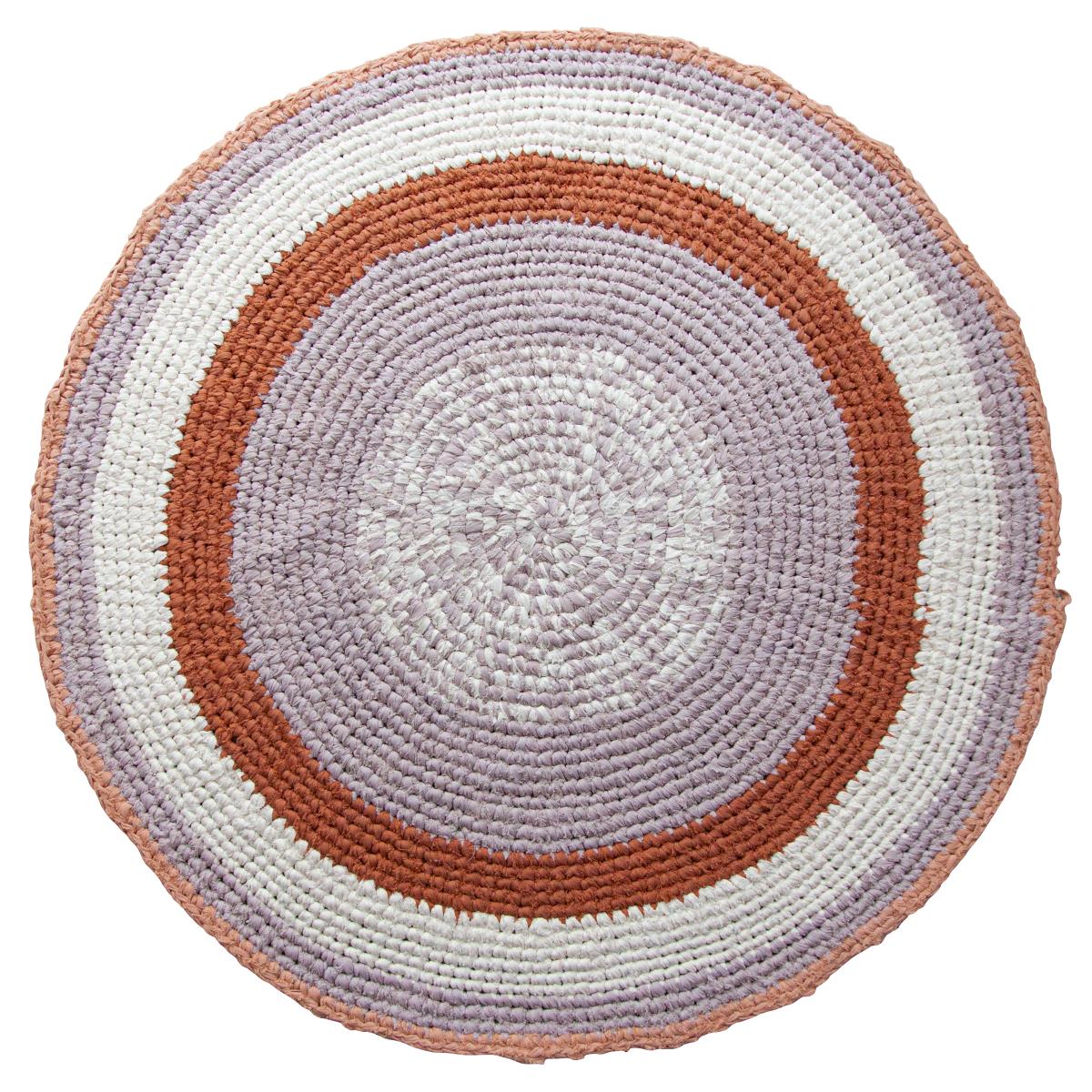 Schöner runder gehäkelter Sebra Häkelteppich „Morning Cloud Pink“, der aus Ringen in verschiedenen Farbtönen besteht. Diese Farben in Rosa, Violett und Weiß erinnern an den Morgenhimmel. Der Teppich hat einen 120 cm langen Durchmesser und ist ideal als Unterlage für kleine nackte Füße, die am Morgen aus dem Bett steigen, oder um nachmittags beim Puzzlespiel als Spielteppich zu dienen. Der Teppich kann sowohl im Kinderzimmer, im Wohnzimmer als auch im Eingangsbereich zum Einsatz kommen, oder an einem anderen Ort, an dem Sie einen schönen Teppich benötigen.